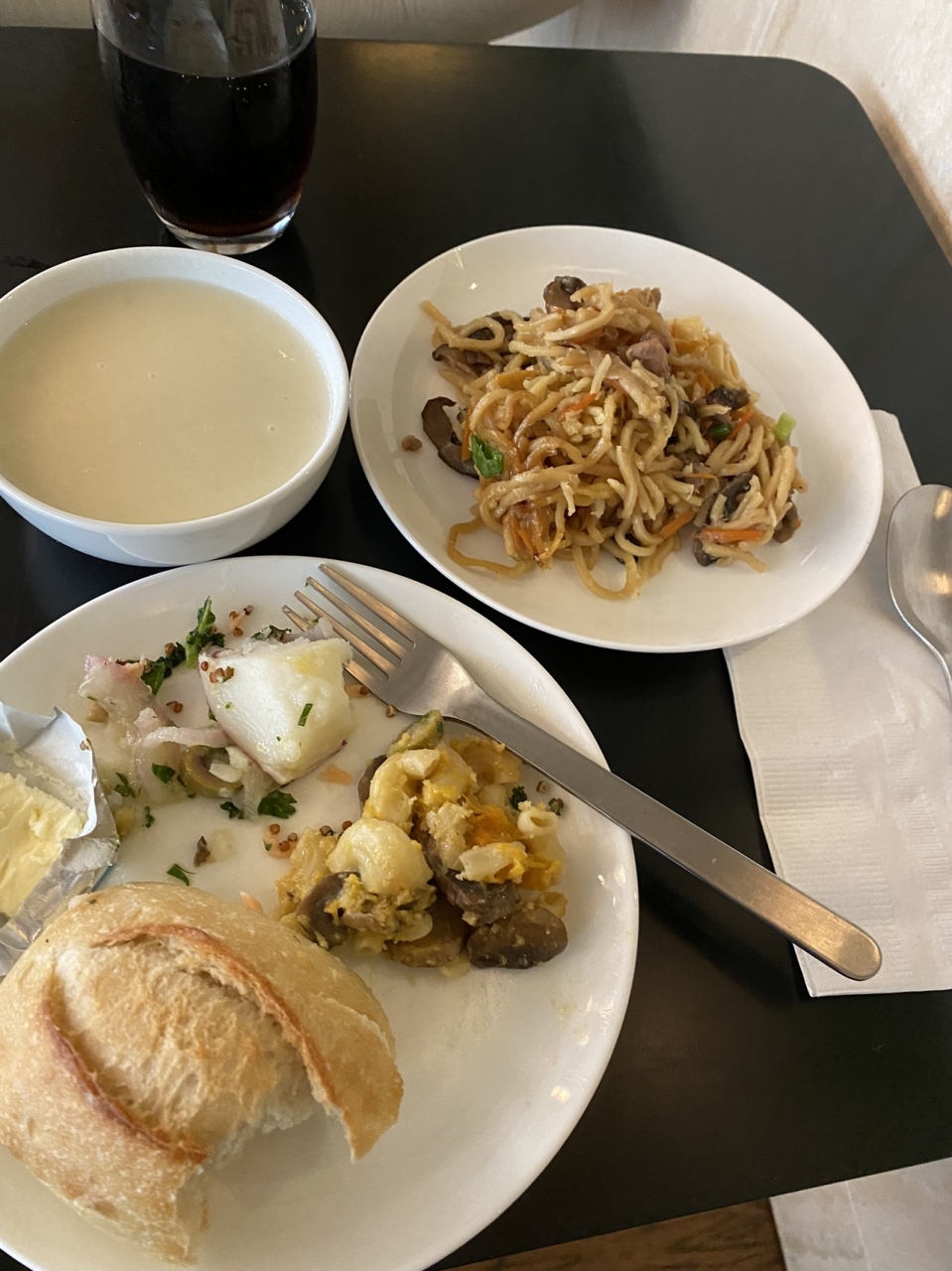食事はランチタイムでクリーム系のキノコのパスタ、中華焼きそば、パン(1種類)、ポテトのスープ、サラダ、ケーキ数種類でしたが、あまり充実している感じではなかったです。