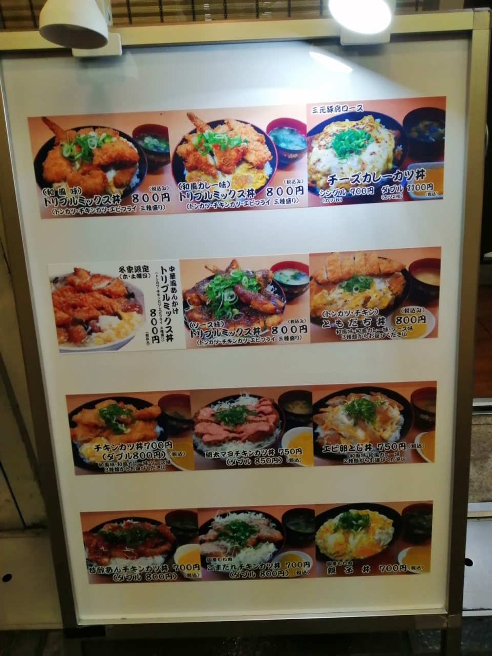 三宮に宿泊した時に晩御飯のお店を探しに、サンプラザをぶらぶらしていて見つけました。地下の奥まったところにある小さなお店ですが、表に出ていたメニューを見ると、チキンカツやとんかつなどがドンと載った色々なカツ丼がおいしそうで決定。カウンターのみのお店です。