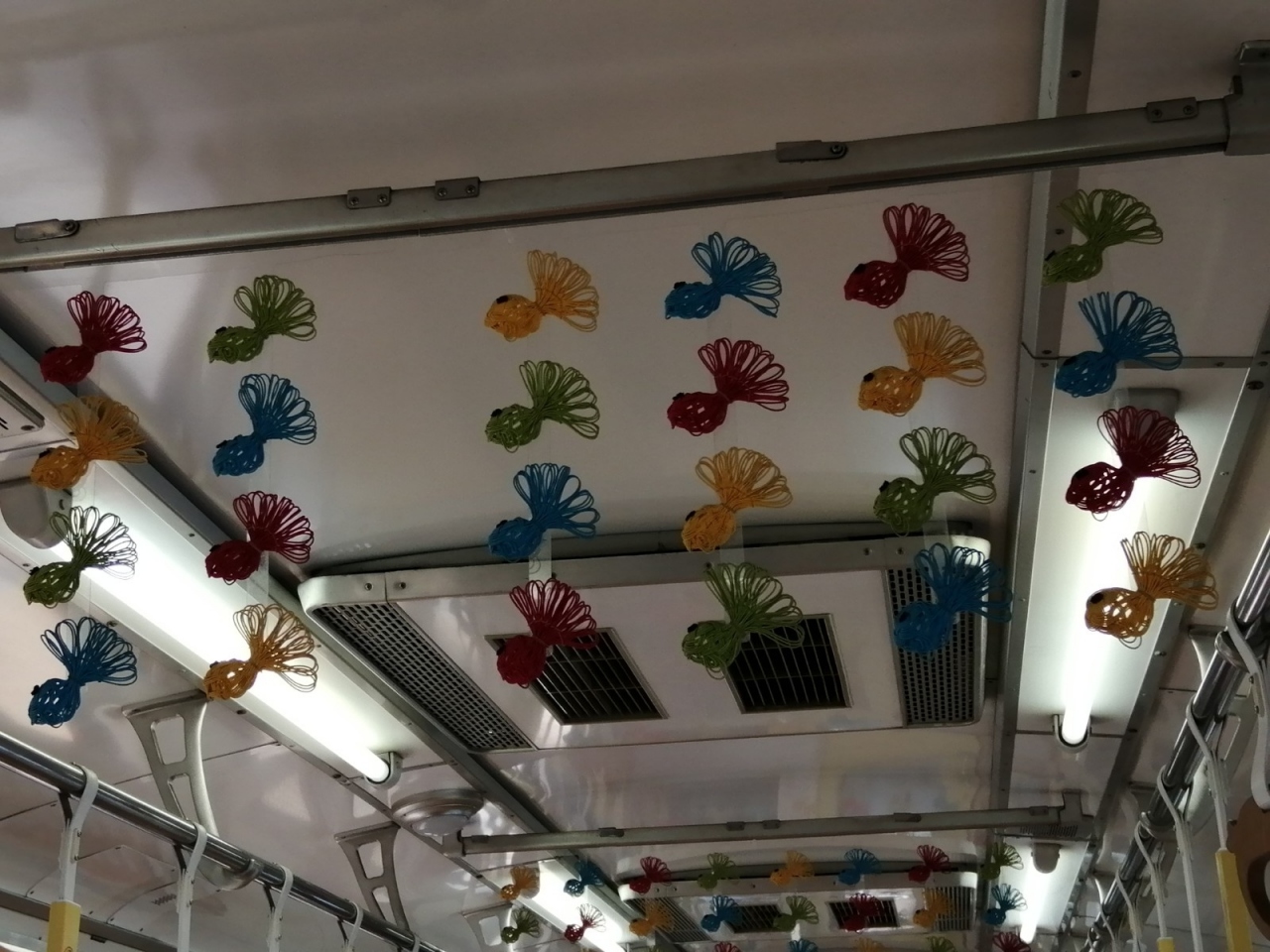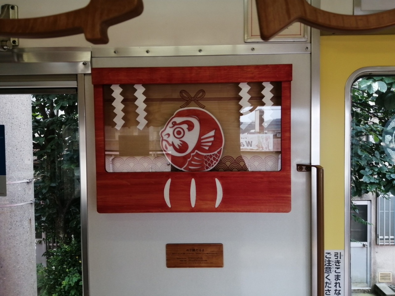 ななという赤い電車とかいという青い電車に乗れましたが、ななは、ピンクのさちとかいの間に生まれた子供という設定で、車内におみくじやめでたい縁起物の飾りなどがたくさんあって、幸せな気分になりました。つり革も魚のデザインでした。