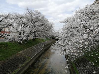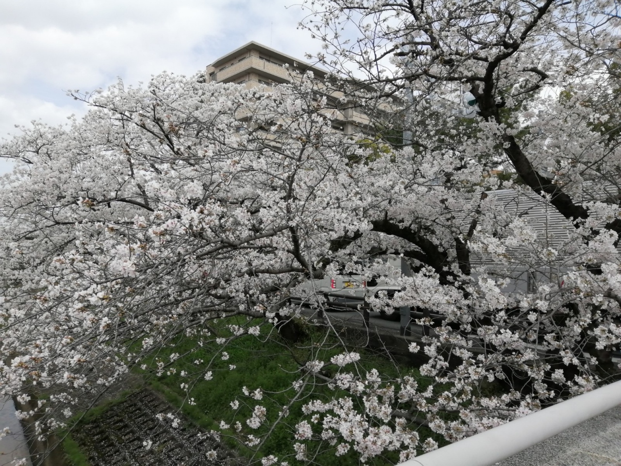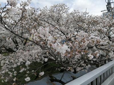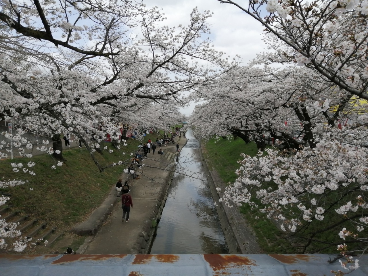 土手沿いに桜並木がありますが、丁度満開で昼時だったため、花見をする人でいっぱいでした。土日に来たことはありますが、土日と変わらない人出でした。