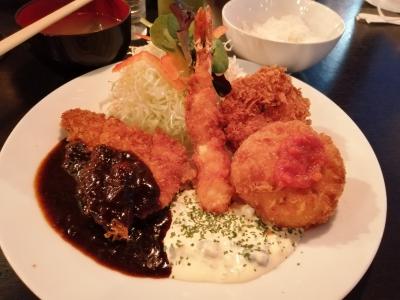 メンチカツ、チキンカツ、エビフライ、クリームコロッケとポテトサラダ、グリーンサラダがお皿に盛られていました。ごはんとみそ汁がついていて、一度だけお代わりできるとのこと。