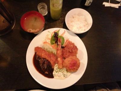 ローストビーフ丼が有名なお店で、本店は高架下にあるそうです。元町店はビルの二階にあり、店内は黒を基調としていて、ロック調の曲が流れていました。レトロなライトがオシャレです。ローストビーフ丼と迷いましたが、ミックスフライセット(1100円)がおいしそうだったので注文しました。