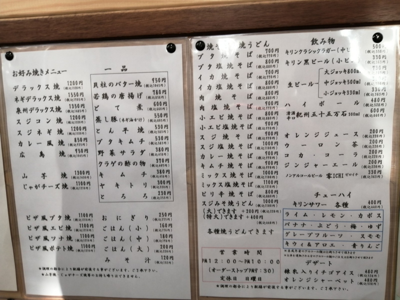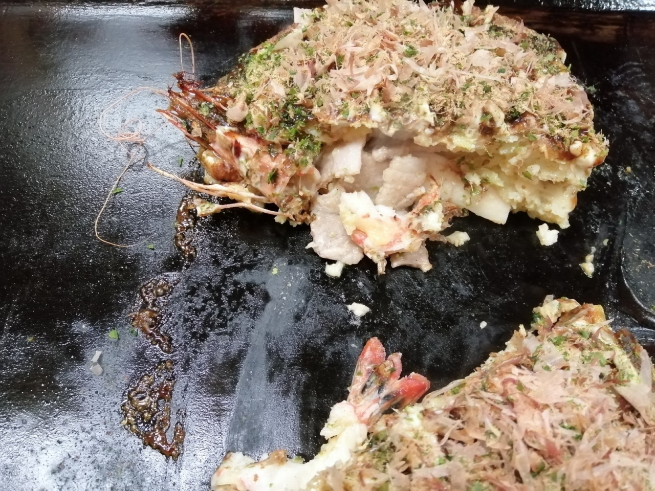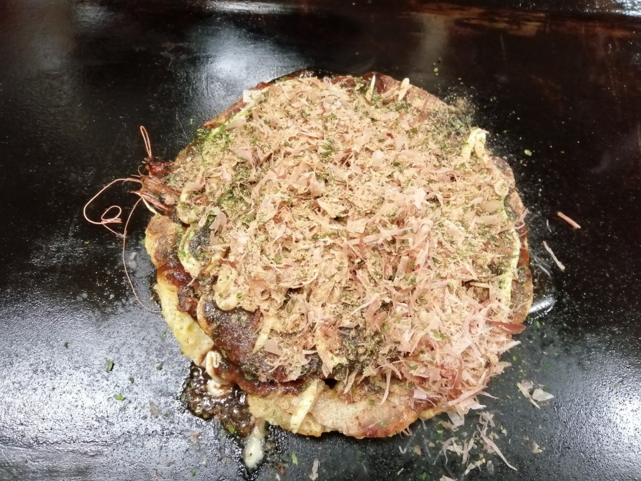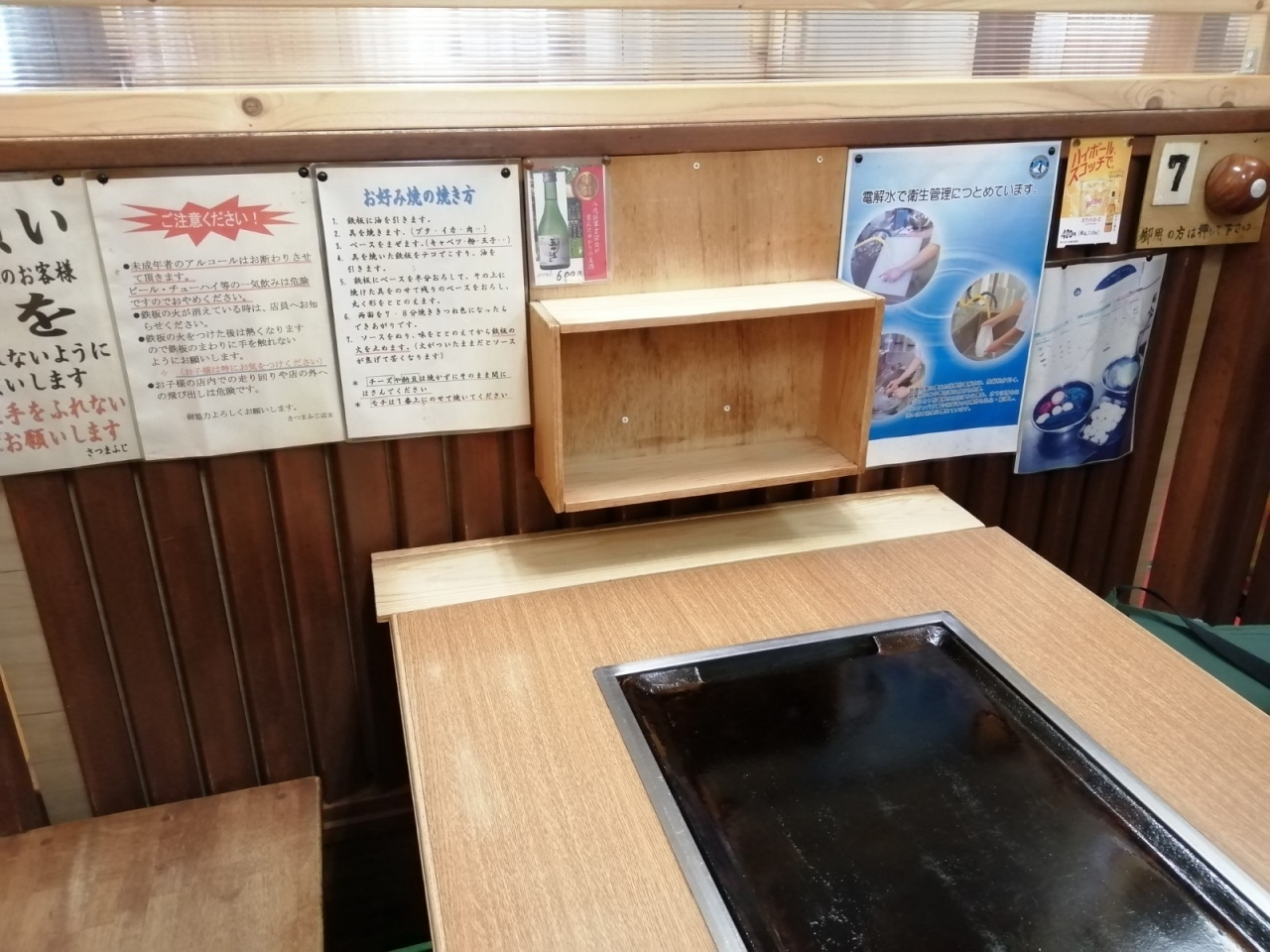 お好み焼きはテーブルの鉄板で自分で焼くか、焼いてもらって持ってきてもらうかを選べます。焼いてもらっても味付けは自分たちでします。各テーブルは高い仕切りで区切られていて、半個室のようになっています。消毒液もあちこちにあり、テーブルには何もなくソースなども都度持ってきてくれます。お好み焼きの種類が多く、迷いました。デラックス焼(1200円)と唐揚げ(750円)を食べましたが、デラックス焼は有頭エビやたくさんの豚肉、紅ショウガなど具だくさんで、唐揚げはとてもボリュームがあり、サクサクしていておいしかったです。