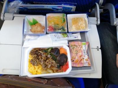機内食は行きも帰りもご飯に具がのった丼で、とてもおいしかったです。
