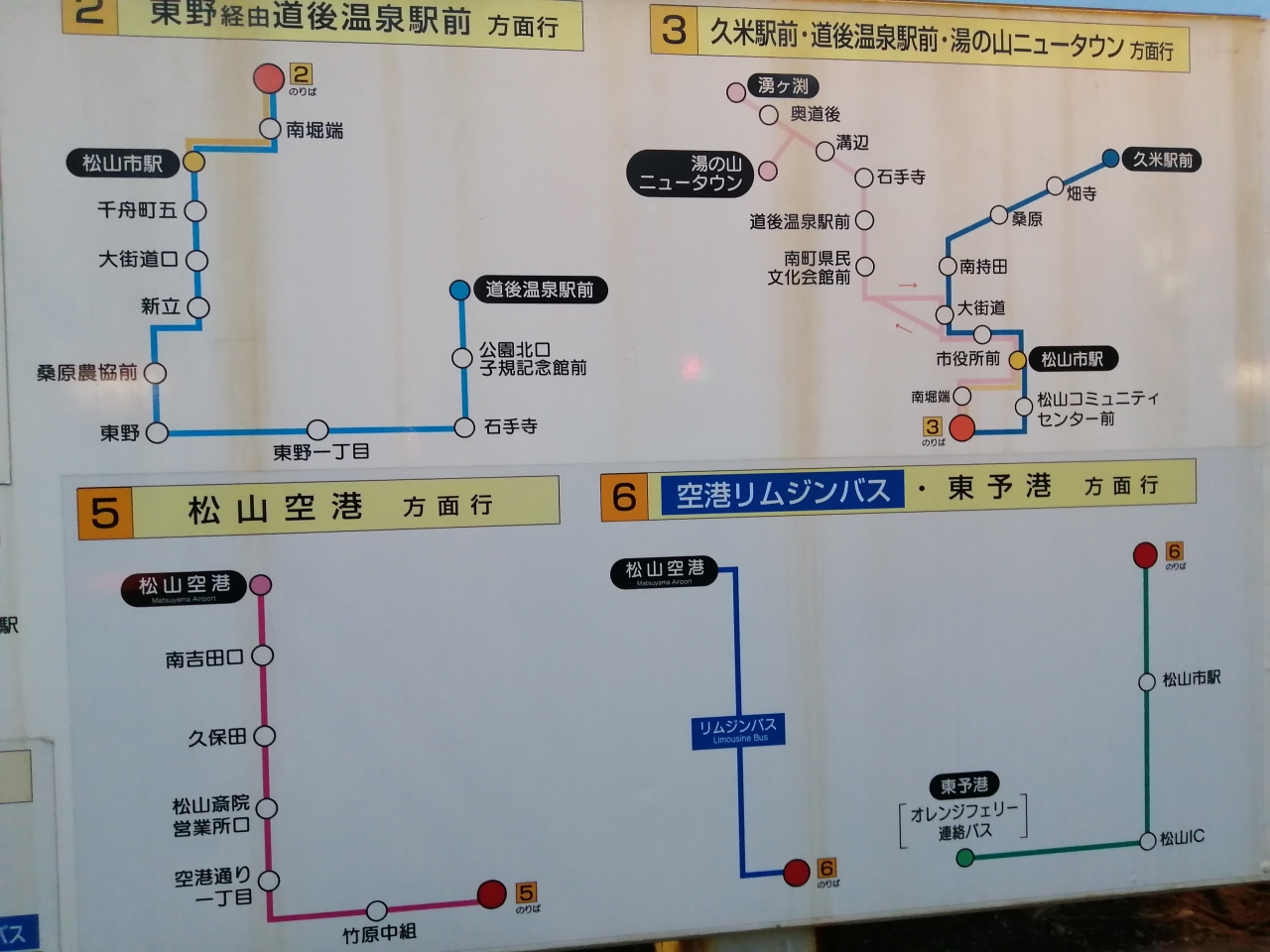 JR松山駅、愛媛新聞社前、松山市駅、大街道、道後温泉と、主要なところに停まります。