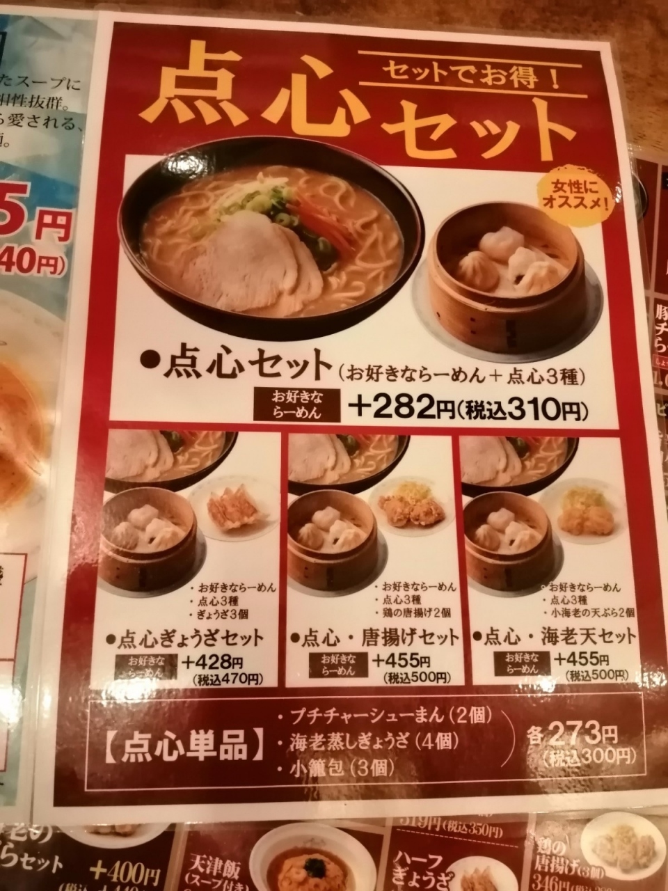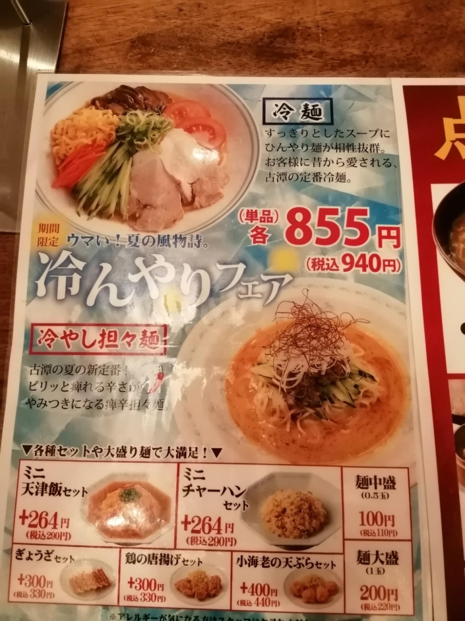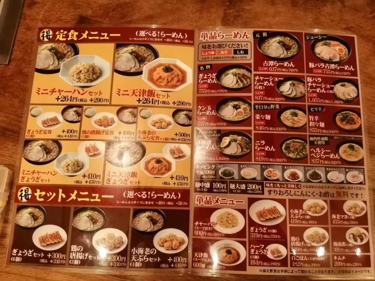5時半くらいに来店しましたが、一番乗りでした。ラーメンとミニ炒飯のセット(990円税込み)を注文しました。私は塩ラーメン、夫は味噌味にしました。