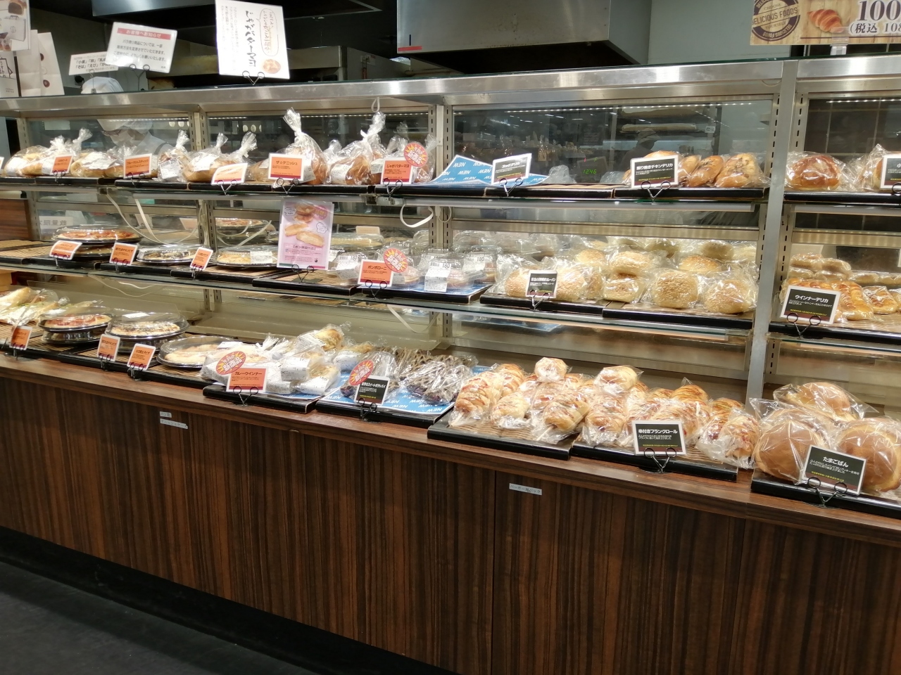 イズミヤさんによく入っている100円均一ベーカリーです。ほとんど100円ですが、140円、160円の商品もあります。種類も多そうですが、14時くらいに行ったら、一番下の段の商品が売り切れていました。どれもおいしそうです。他の阪急ベーカリーで食べたことがありますが、大きなメープル味のデニッシュパンがとてもおいしいです。