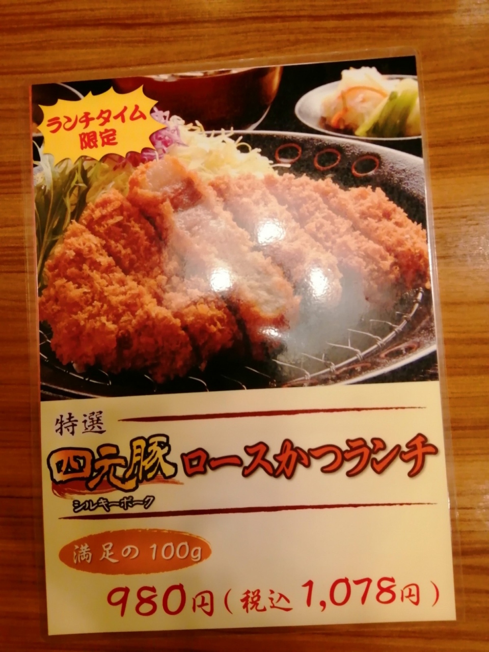 17時少し前に入店。ロースかつ御膳を注文しようとしたら、ランチタイムは17時までなので、まだランチの注文ができるとのこと。ランチ限定の四元豚ロースかつ御膳(980円税抜き)を注文。