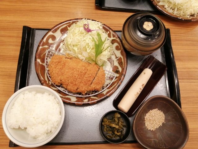 しじみ汁とごはん、キャベツはお代わり自由でした。四元豚ロースカツ(100g)は、お肉の味がしっかりしていて、軟らかくおいしかったです。しじみ汁も熱々で出汁がしっかり出ていました。お茶はえびす茶という、ケツメイシを使ったお茶らしく、おいしかったです。- 旅行時期