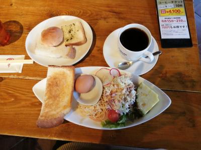 モーニング(7時から11時までに入店)に行きました。好きなドリンクにパン食べ放題と、ゆで卵、サラダ、フルーツがついて、ドリンク代プラス200円でいただけます。90分制で、パンはミニパンが9種類くらい並べられます。食べ放題のパンにはない売りの食パン(一枚の半分)がセットについていて、トースターで焼いてバターを塗って出してくれます。