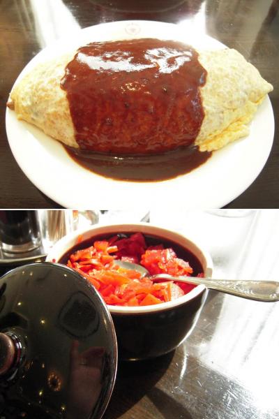 ハヤシライスは肉少な目、たまねぎ多目でコクのあるソースは、確かに長年の歴史を感じる秘伝であるのかもしれないが、たまねぎの苦味が強くて素直に美味しいとはいえない感じ。
