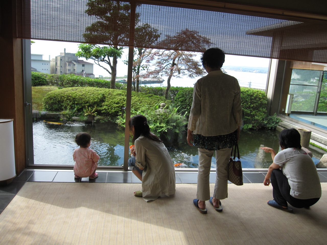 部屋からの富山湾が綺麗に見える。歩いてすぐの処に綺麗な砂浜があり、海水浴が出来る。娘の旦那が釣りが好きで、近くの波止で投げ釣りをやり、大きなチヌを釣って喜んでいた。食事処も綺麗で、食事も美味しかった。廊下も広々していて幼児連れにはありがたかった。少し遠距離の孫との初旅行にこの宿は満足を増してくれた。