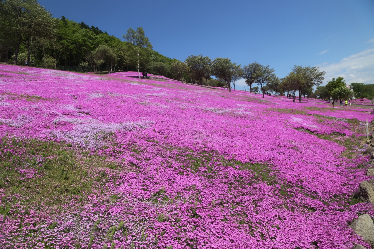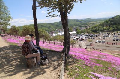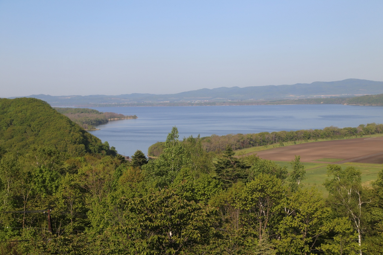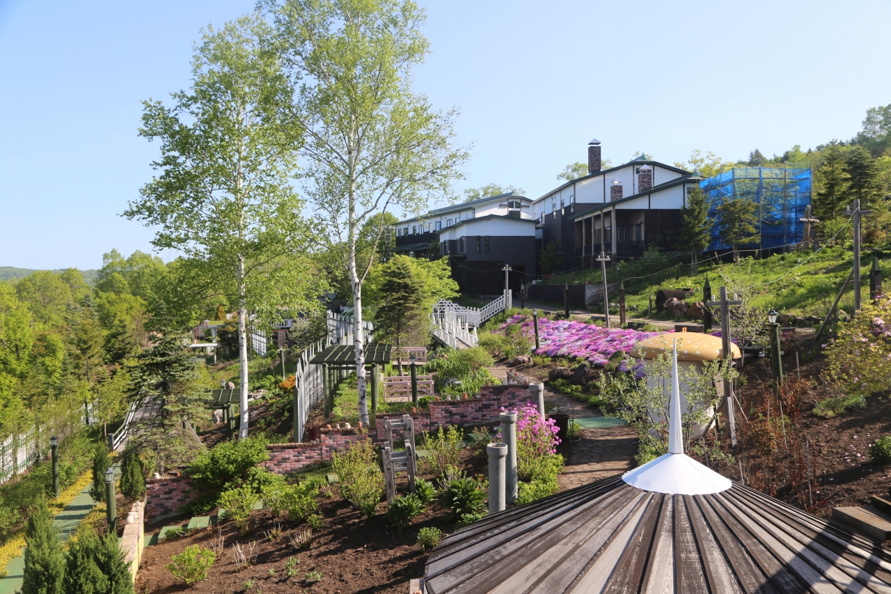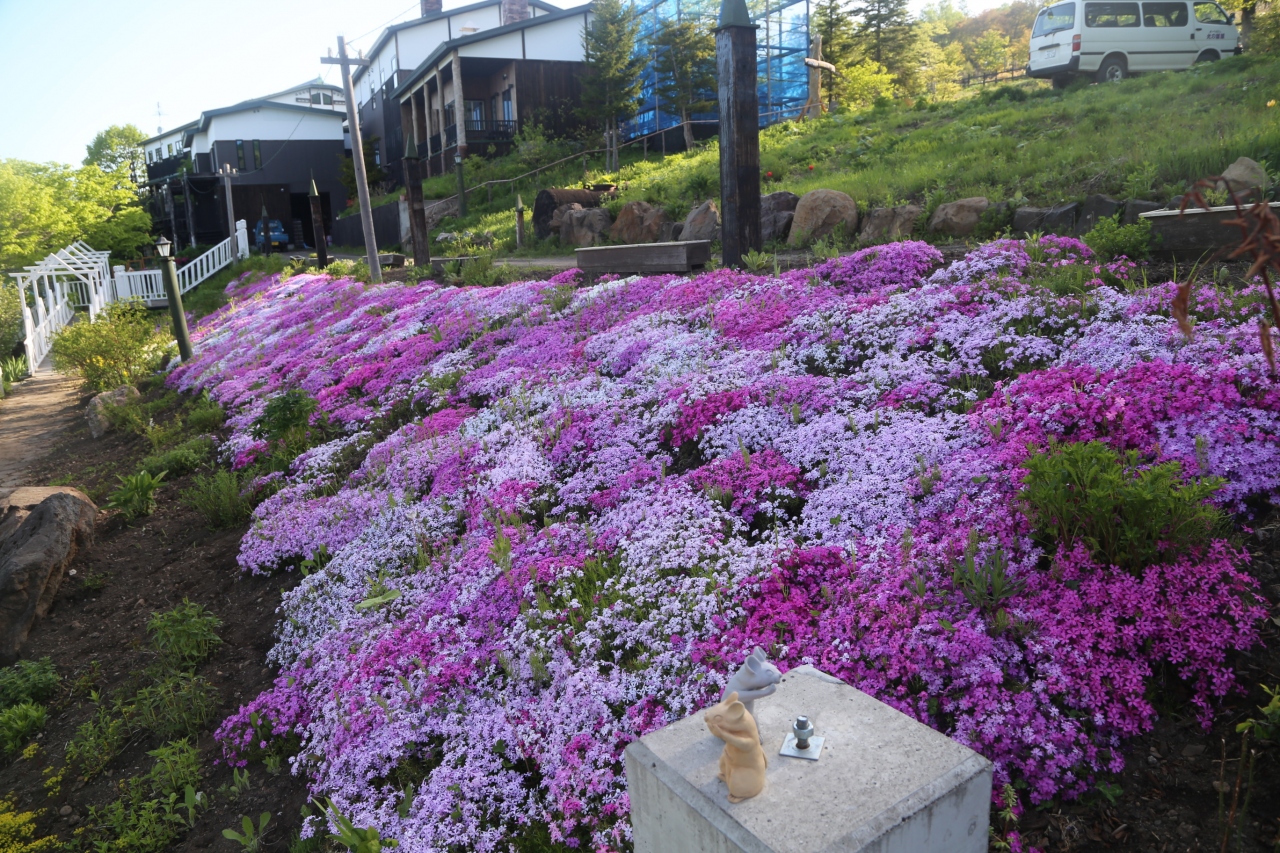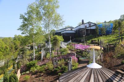 道東、5月末の緑溢れる季節。桜、つつじ、芝桜、グミ、梨等が綺麗に手入れされた庭で綺麗に咲いていた。バックのホテルの素朴な建物がうまく調和していた。眼下に網走湖も広がっている。