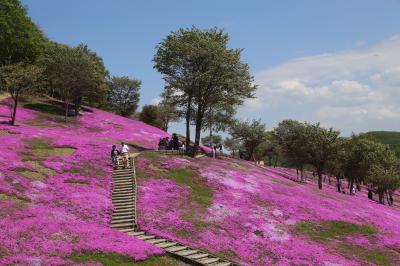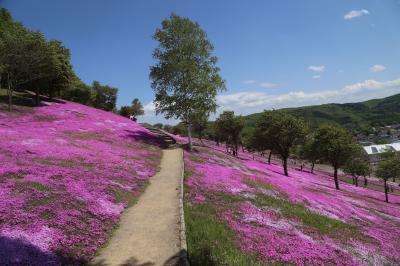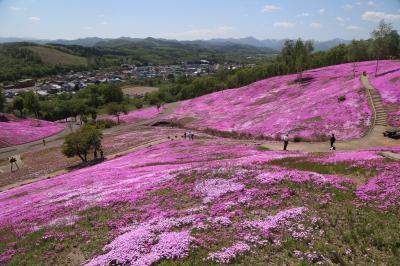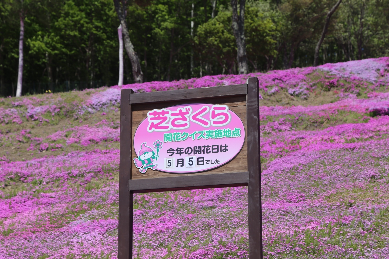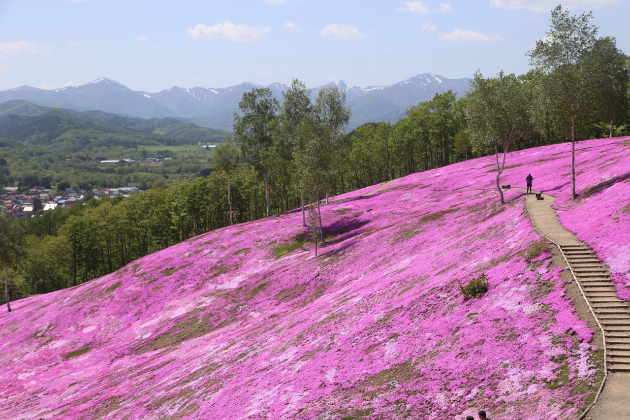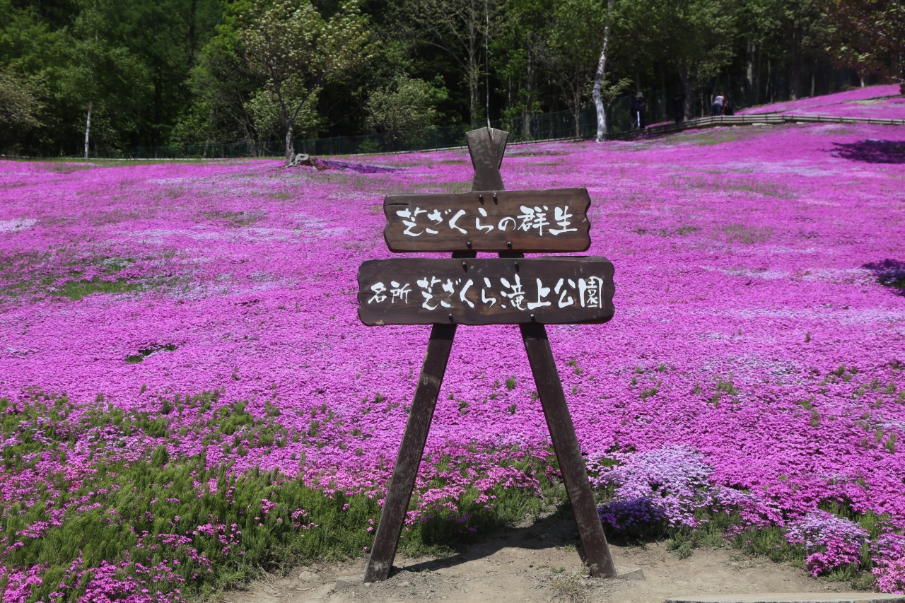 道東、5月末の緑溢れる季節。桜、つつじ、芝桜、グミ、梨等が綺麗に手入れされた庭で綺麗に咲いていた。バックのホテルの素朴な建物がうまく調和していた。眼下に網走湖も広がっている。