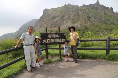 雲が低く垂れこめ、有珠山山頂がほとんど見えないので、ロープウェー乗るの止めようかと言っていた矢先、雲が高くなり、有珠山が良く見えるようになった。7人のメンバーでロープウエーに乗る。頂上駅には有珠山の噴火や昭和新山のプロジェクターでの説明がなされていた。15分ほどで有珠山火口展望台まで登れる。道は整備され、子供でも十分登れる。8月なのに北海道ならでは、アジサイも元気に咲いていた。健脚の方は火口を周遊できる道もある。孫連れで時間もない我々はパス。