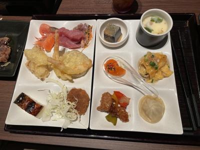 夕食のメインは県産和牛とアグー豚のしゃぶしゃぶです。前菜系の美しいおかずやお寿司、デザートも豊富で楽しめます。早い時間に行ったからか、利用する人が少なめで、のんびり食事ができました。対して朝食は平日だというのに大混雑。それでも、朝からステーキや海鮮丼、沖縄料理と、品数豊富で豪華な朝食に大満足。なんとビールまで無料でした。