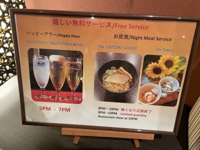 ホテルに到着したのは20時。ちょうどお夜食が始まったのでレストランで頂きました。ラーメンかアイスから選べました。数量限定でしたが美味しいラーメンでした。