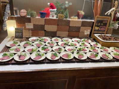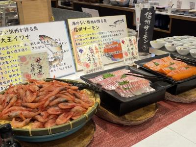 夕食は前回あったカニを楽しみにしていましたが、なくなっていたのが残念でした。それでも信州サーモンや信州大王イワナの刺身やカルパッチョ、アルプス牛のローストビーフなど、信州の食材を使ったメニューも豊富で、美味しくいただきました。