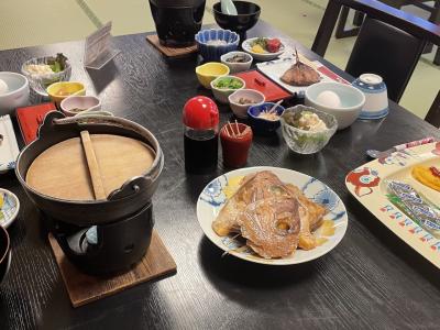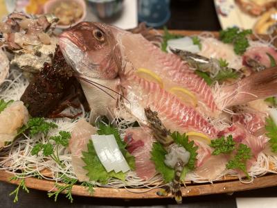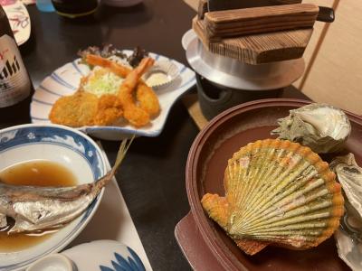 夕食は2階の会場でいただきました。豪華な舟盛りの刺身は鯛の活造りに伊勢海老・鮑・サザエ・車海老など。新鮮で食べきれないほどの舟盛りに感激しました。もずくやヒジキなどの小鉢もメチャうまです。エビ・カキ・アジのフライ、魚の煮付け、貝の陶板焼き、ウニの釜飯と次々と出てくる海の幸はどれも美味しくて、お腹がはち切れそうなくらい食べました。