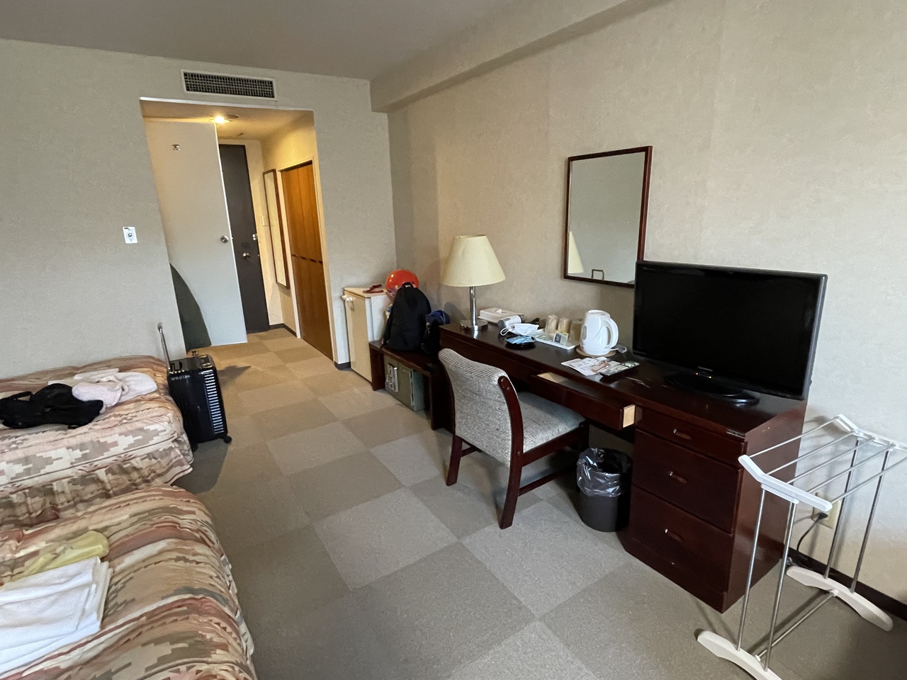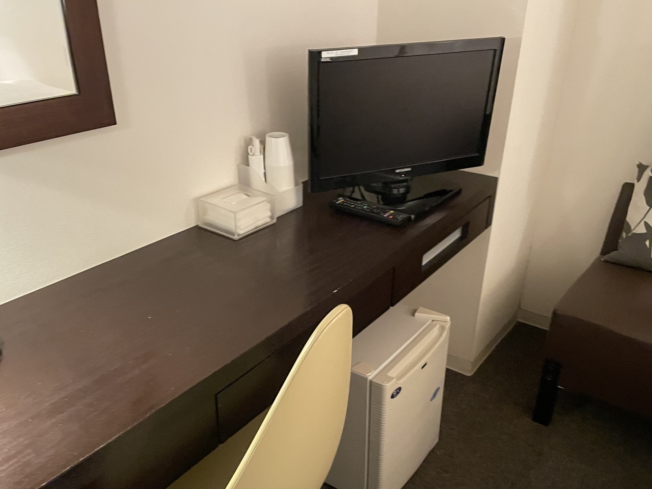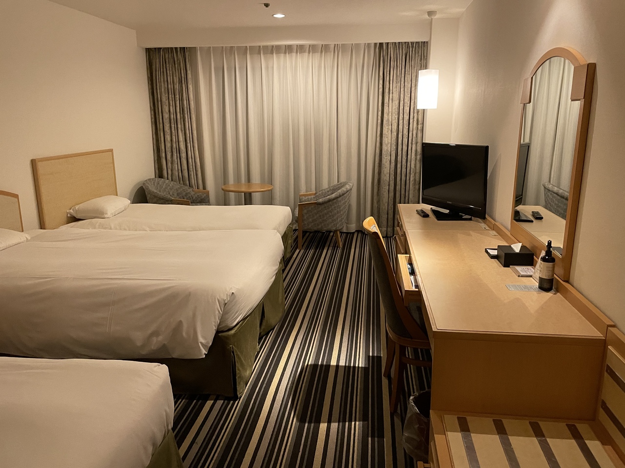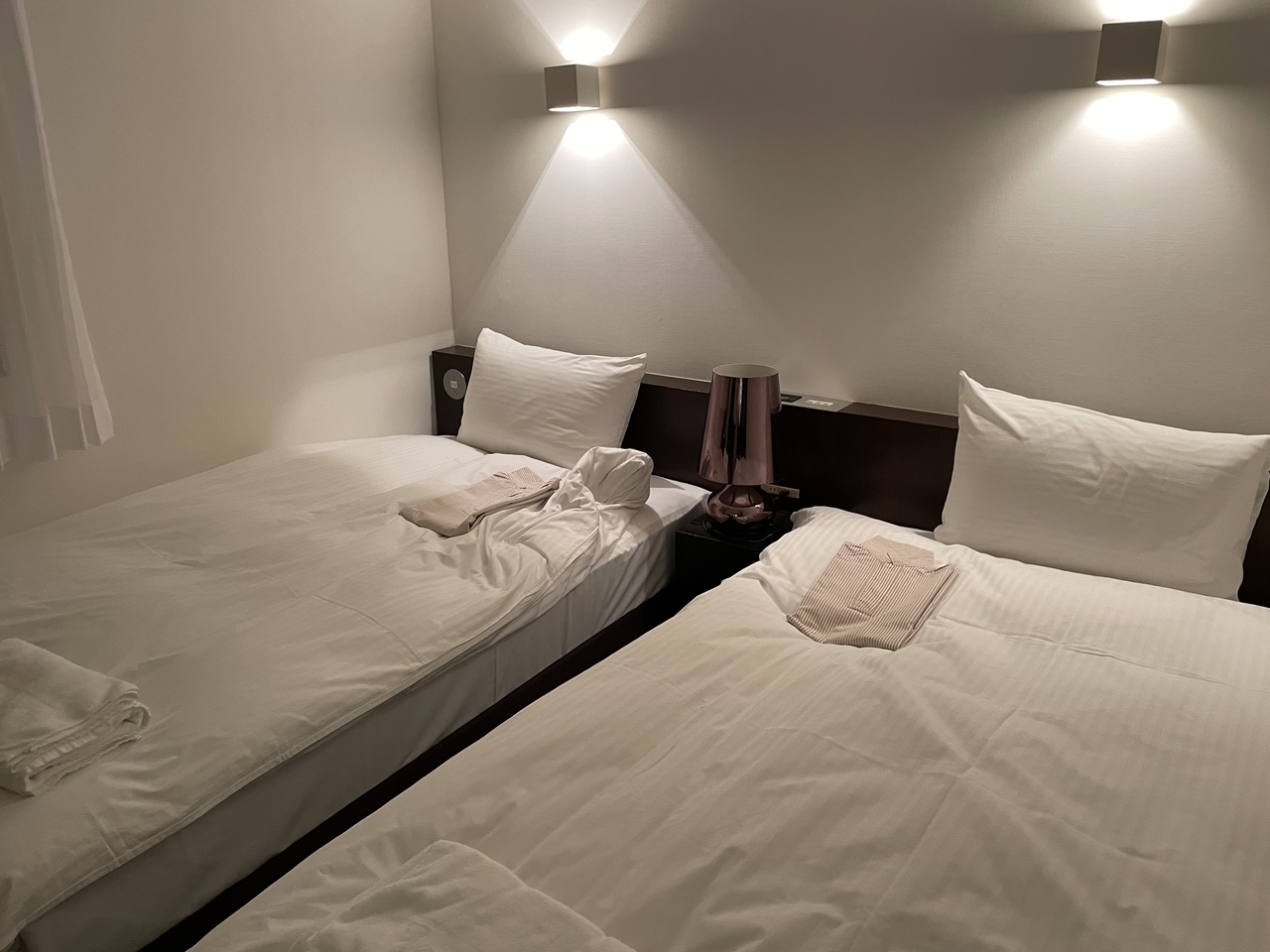 グローバルゲートビルの上層階(31階~36階)に位置するホテルです 。客室は32階のツインルーム、シンプルでスタイリッシュなお部屋です。遮るものが何もない大きな窓からの眺望は素晴らしいものでした。夕方、日没後、深夜、早朝と、時間による景色の変化を楽しめます。夜景は特にキレイで贅沢な時間を過ごすことができました。