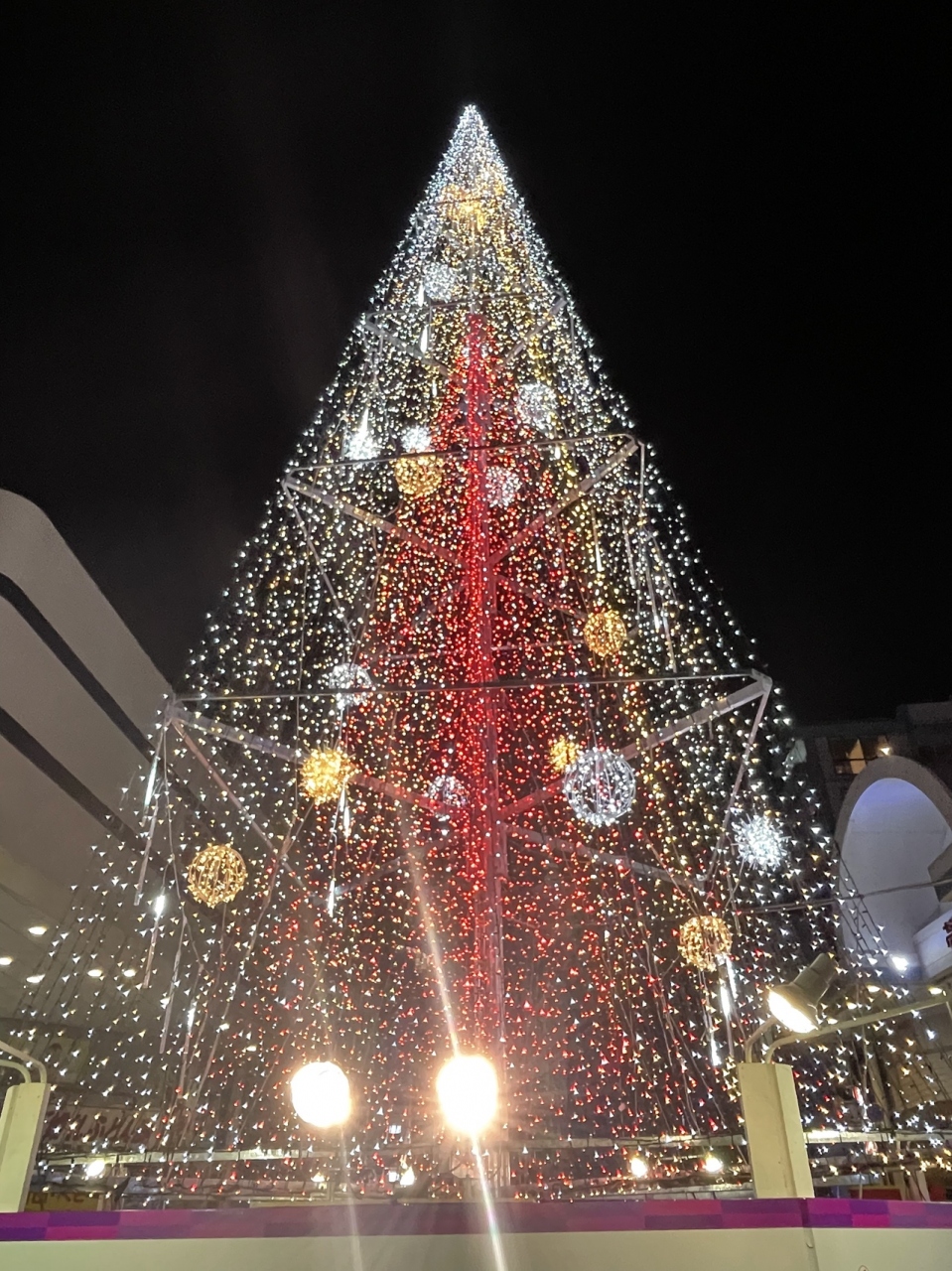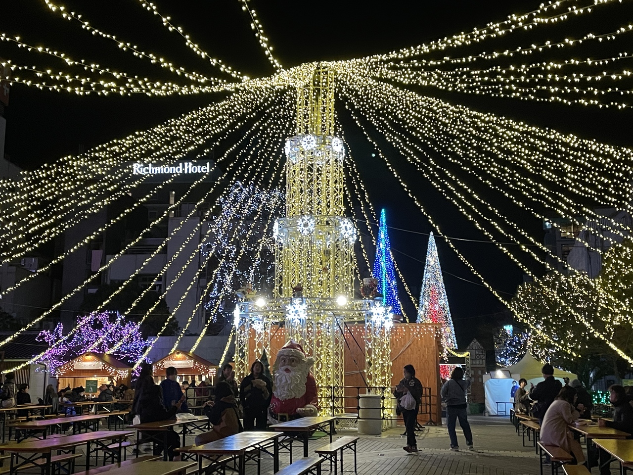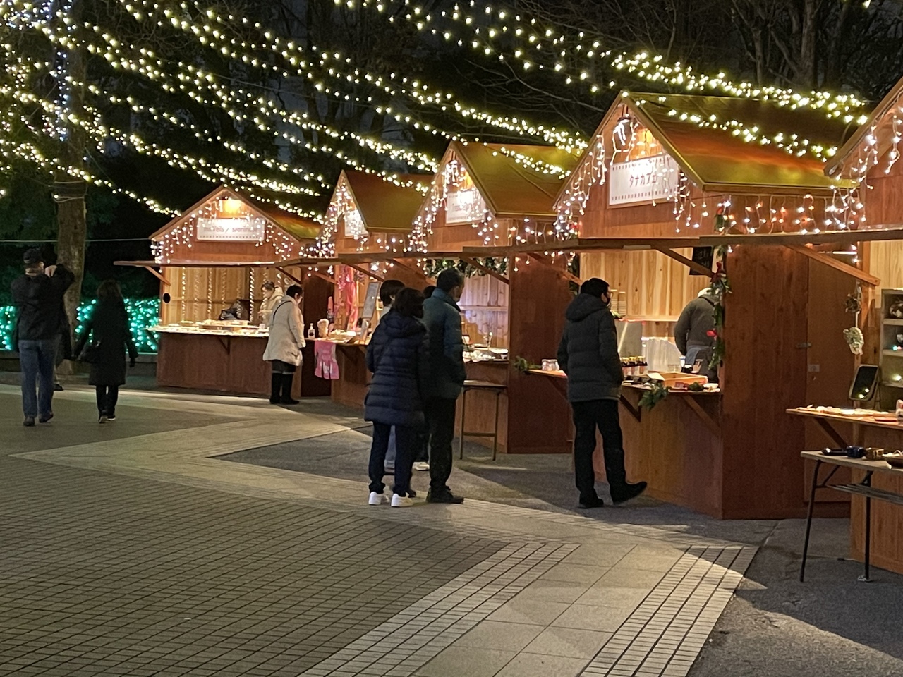高知市中央公園で2022年12月16日~25日までの10日間、ドイツ発祥の伝統的なお祭り「クリスマスマーケット 2022 in 高知」が開催されました。ちょうど旅行の時期と重なったので行って来ました。今年初めて開催されたクリスマスマーケットですが、高さ10mのイルミネーションタワーが設置され、タワーの頂上から約50本のイルミネーションコードが放射状に広がっていて、とてもきれいでした。本格的な木造ヒュッテ(小屋)が再現され、美味しそうな料理や雑貨などが販売されていました。平日は21時30分まででしたが、訪れた時間が遅かったので、売り切れのものが多く残念でした。(今年も開催されたなら)早めの時間に行くことをおすすめします。ヨーロッパのクリスマスの雰囲気が味わえてとても楽しめました
