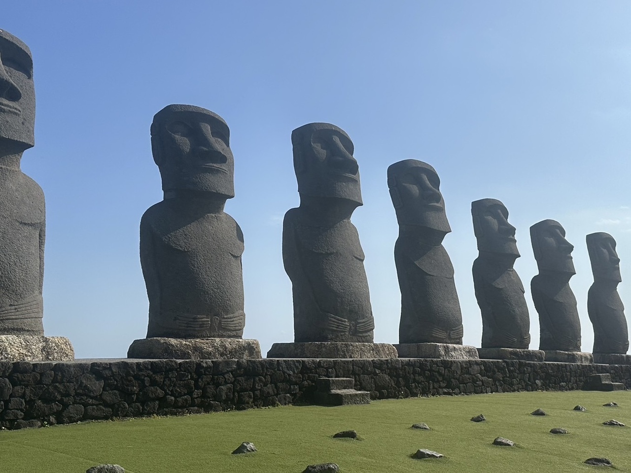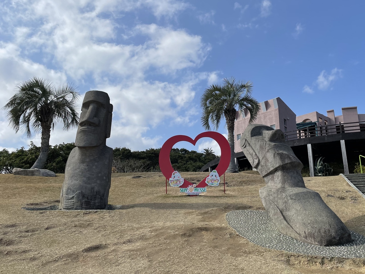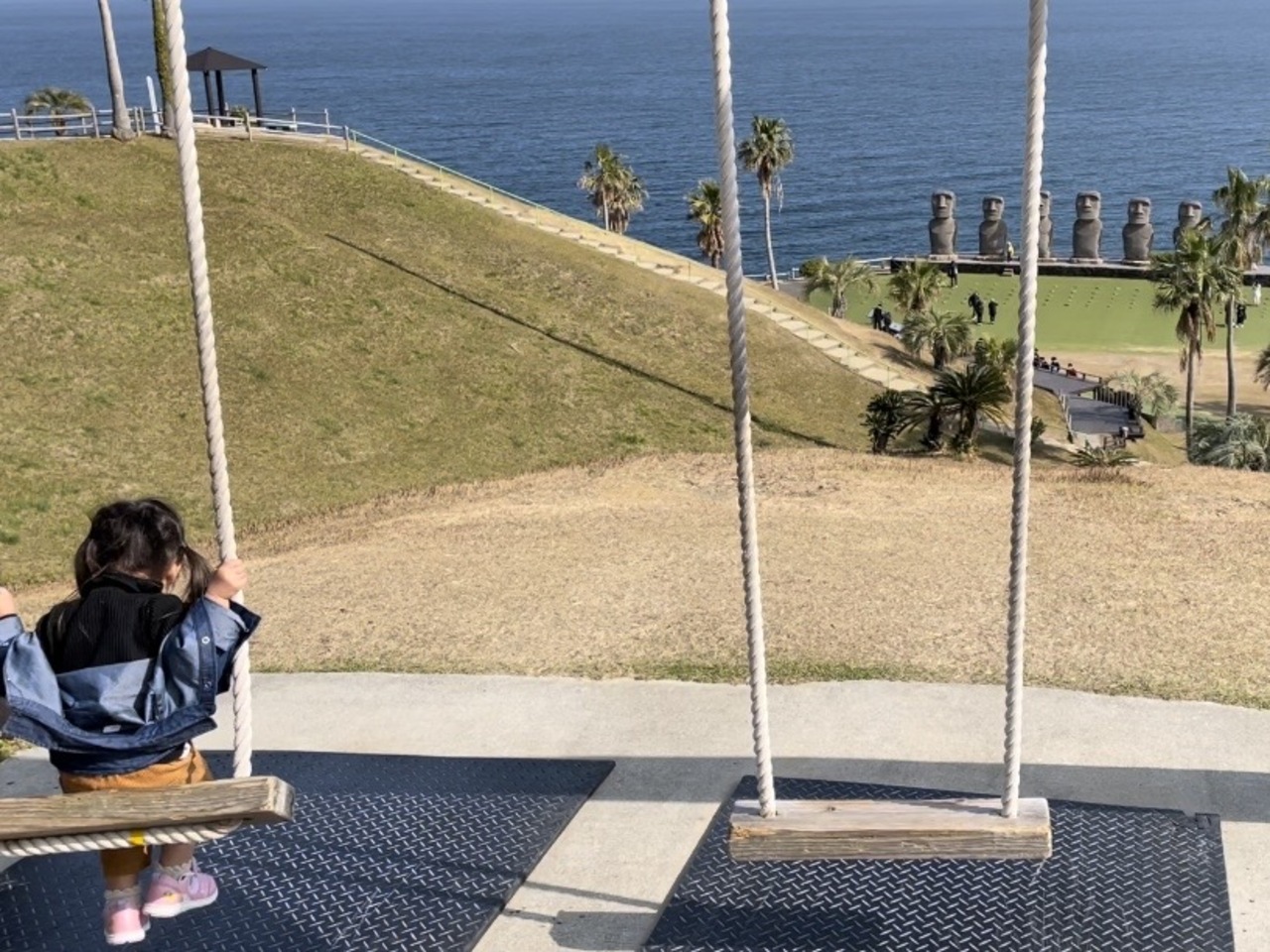 小さな子供も楽しめそうな観光スポットだと思い訪れました。『サンメッセ日南』はモアイ像で有名な広い公園です。入場料は大人1000円(値上がりしたようですね)。モアイ像を見るためだけには正直、高いな~と思いました。園内は傾斜がある坂道が多く、子供を抱っこして、歩いて行くのは大変です。そこで30分1000円の有料のカートで移動しました。ガタガタするのでスリルもあり、子供たちも喜んでいました。30分はあっという間で追加料金は30分毎に500円でした。丘の上からは7体のモアイ像と日南海岸の海が見事に調和された眺望を楽しめます。2歳の孫娘は空中ブランコがお気に入りでした。ブランコからの景色も絶景です。