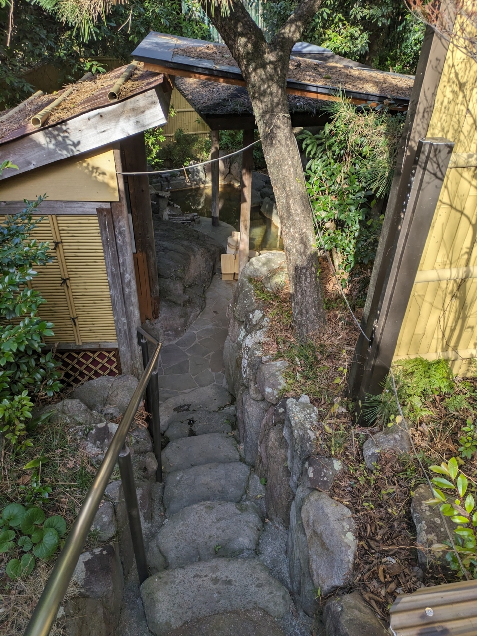 2食付きの客には貸し切り露天風呂が一回使える。脱衣場も外、シャワーも無くだた浸かるだけ。それが良い。石鹸使わないから湯が綺麗。雪が舞い寒いかなと思ったけどポカポカと温まった。