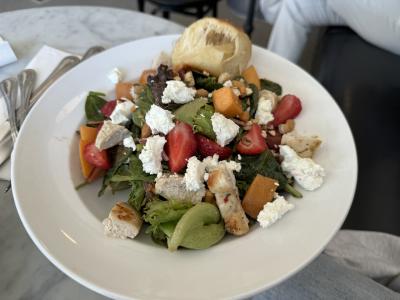 いちごとローストした桃とチキンのサラダ。あっさりしていてガツガツ食べら...