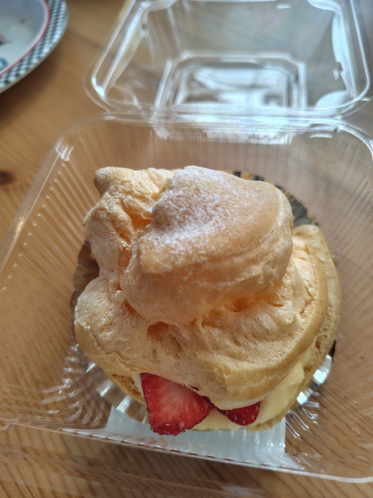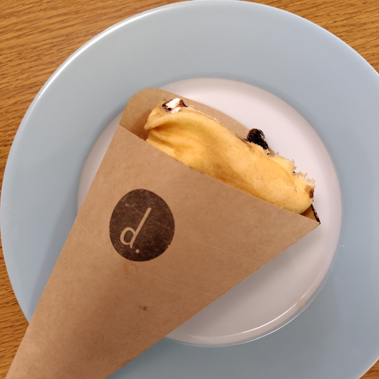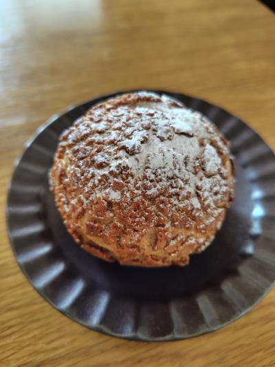 メインはクレープ。15種類ほどあり、気になったラムレーズンのクレープをテイクアウト。その他にマフィンなどの焼き菓子あり、こちらもテイクアウトで。