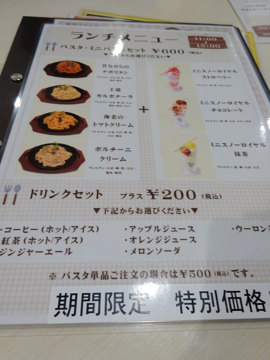 期間限定のパスタ&ミニパフェのセットが激安600円(゚д゚)!普通の大きなパフェも捨てがたかったけれど昼食時だったし予算の都合もありこのセットを家族分頼みました。