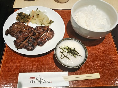 宮城に来たからには絶対牛タン!と意気込んでいましたが、メニューに品切れの文字が…。聞くと麦飯が売り切れてしまったため、「定食」はできないとのことですが、牛タン単品は行けるということで、牛タン2皿ととろろを2つ。