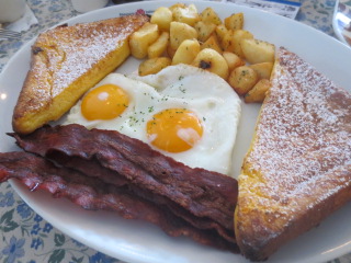 お店の人気メニューはエッグベネディクト。写真はフレンチトーストブレックファースト。いつもローズガーデンの看板メニューのエッグベネディクトを食べていたので、今回はちょっと変えてみました。