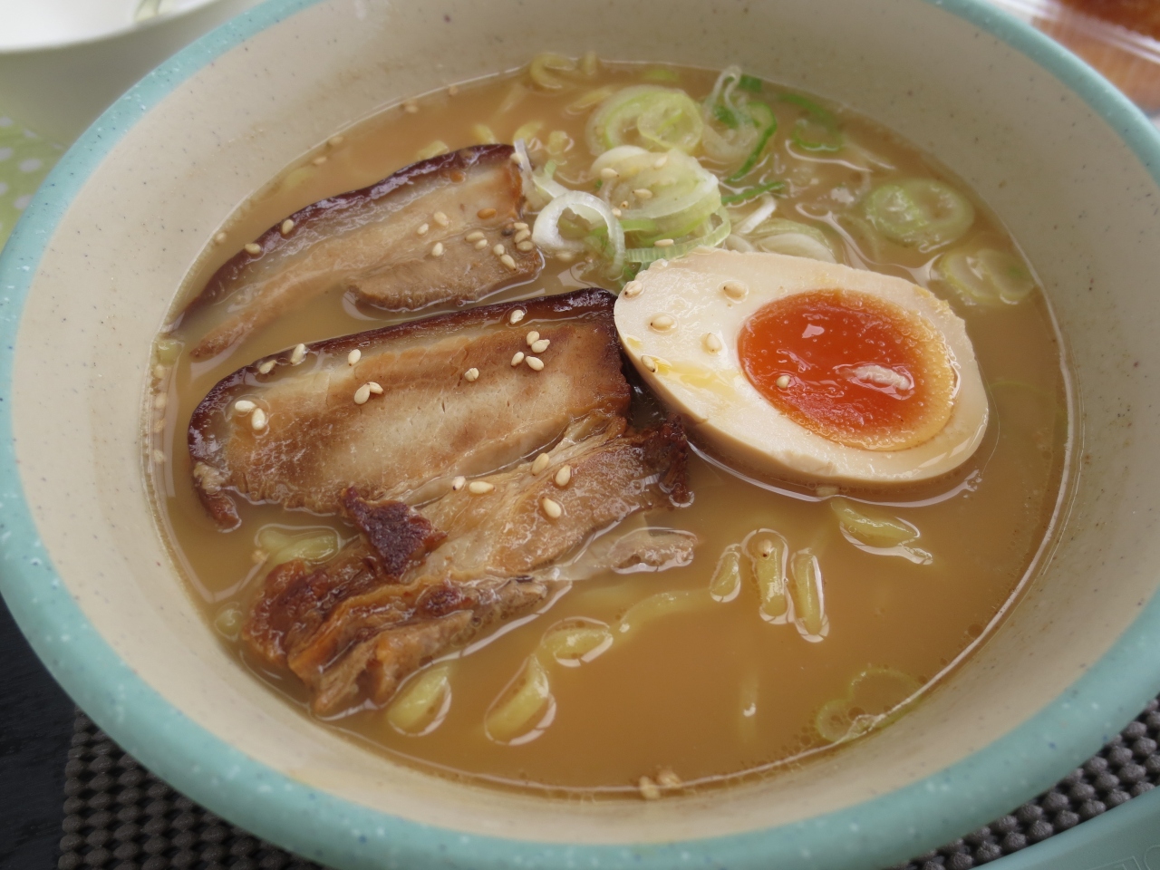 まず驚いたのは、スープが白く濁っていること!!もしかしてコッテリ系?かと思いましたが、スープは意外とあっさりでした。とんこつベースだとは思うんですがね。