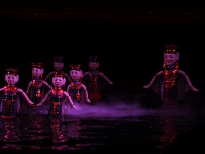 3時です、タンロン水上人形劇の始まりです。一等席とはいえ、前から3列目...