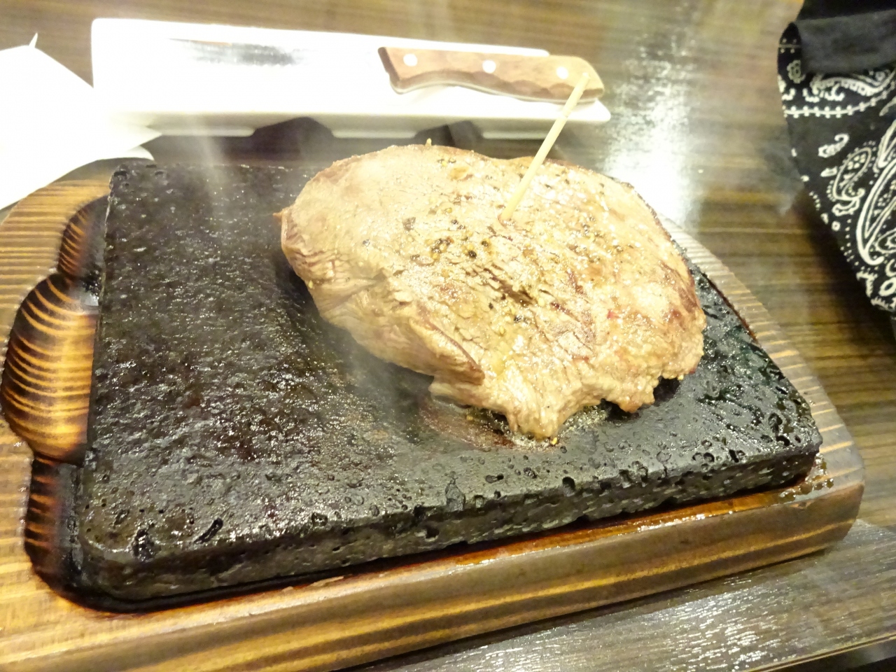 肉は、溶岩プレートの上にレア状態で到着。溶岩プレートで自分の好みの焼き加減にできます。