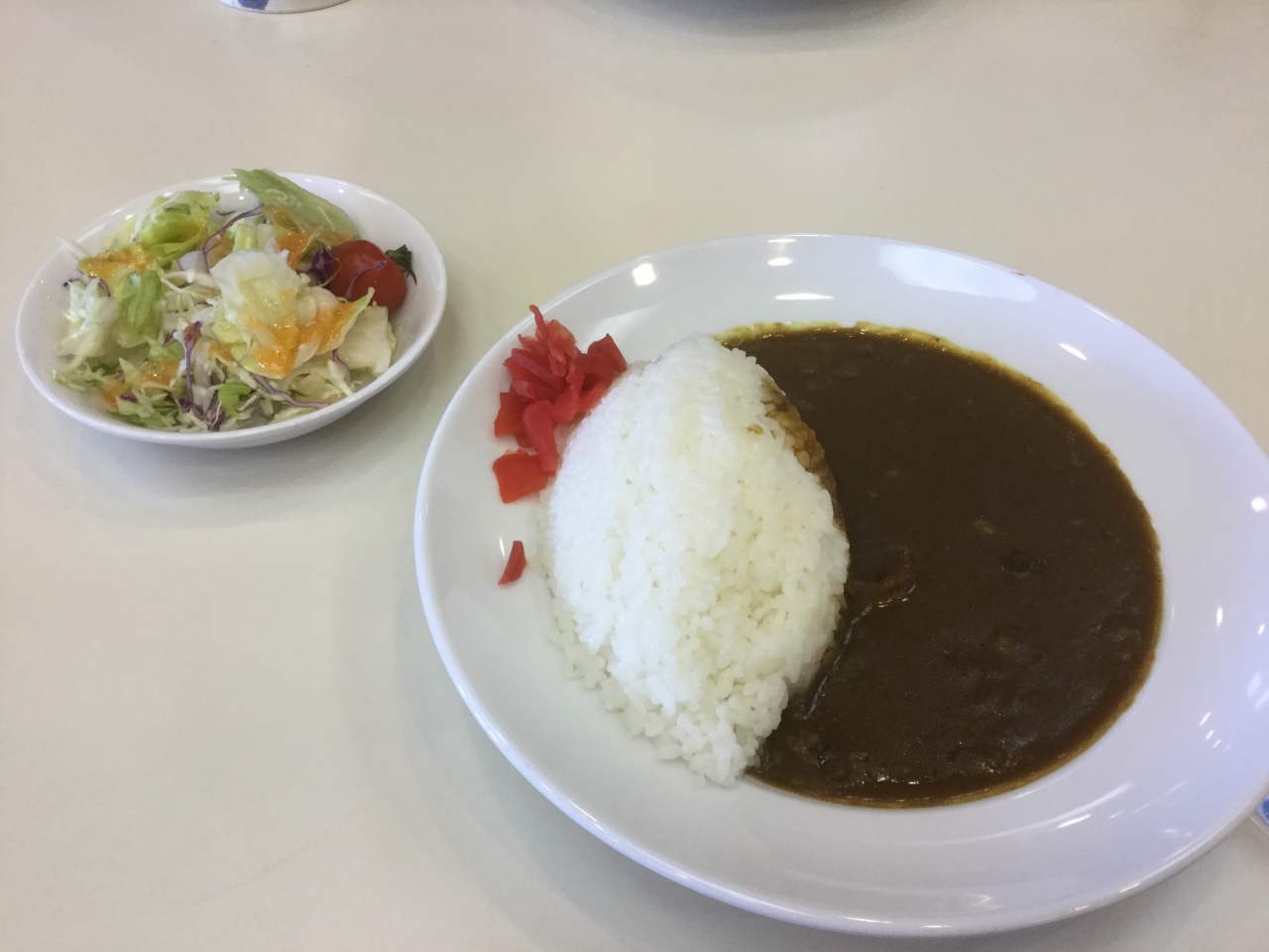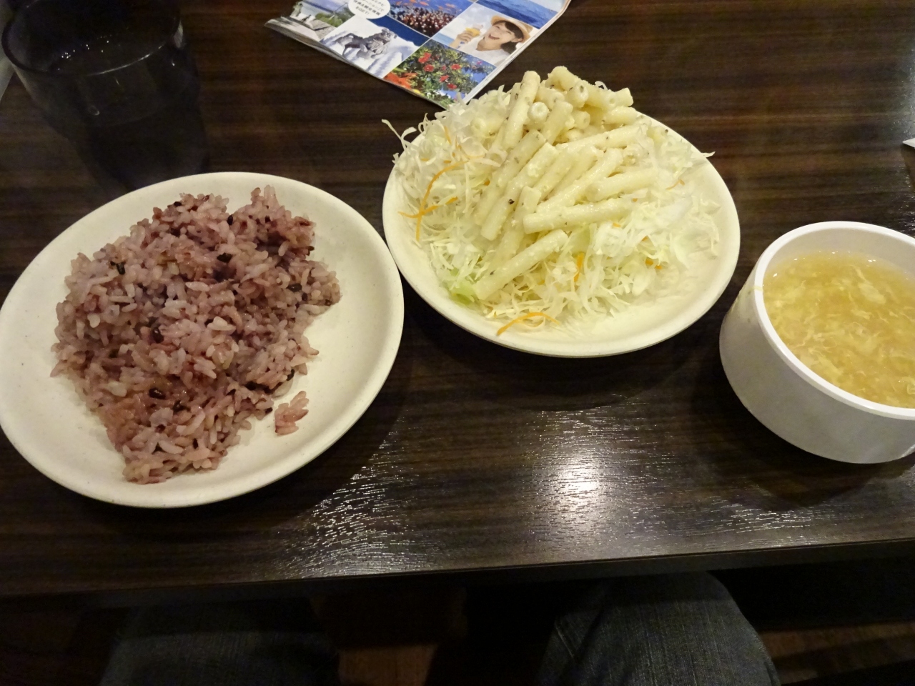 券売機で食券を購入して店内へ。店の中央にはサラダとスープ、ご飯がセルフサービスで提供していました。