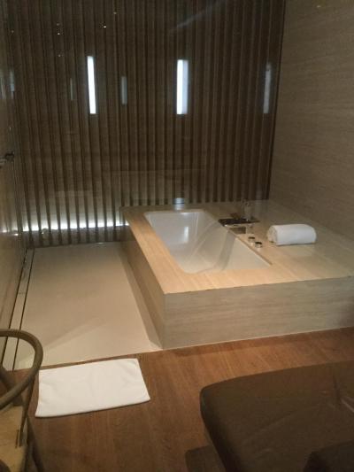 部屋はクイーンルームを利用。バスルームに仕切りがなく、超開放的なのが印象的でした。シャワールームとトイレの扉はスライドします。