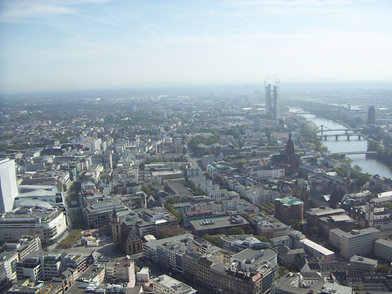 高さ200mほどの屋上展望フロアから、フランクフルト市内を一望できる場所です。一面ガラス張りの円柱型で、紅白の避雷針のようなものが乗っている建物がマインタワーです。