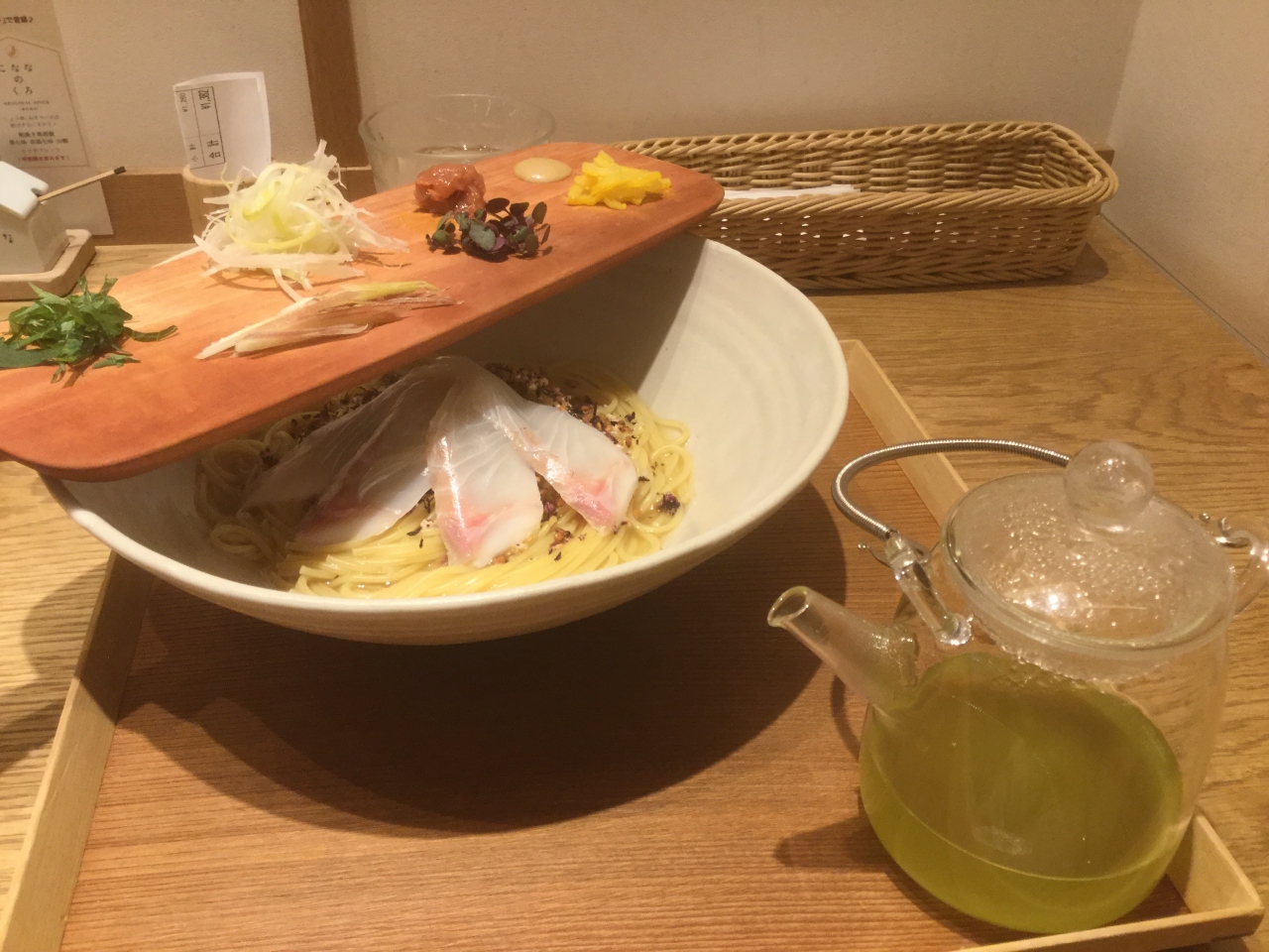春限定の鯛がトッピングされたパスタをオーダーしました。お茶をかけて食べるお茶漬けスタイルのパスタで、和洋折衷の雰囲気でした。