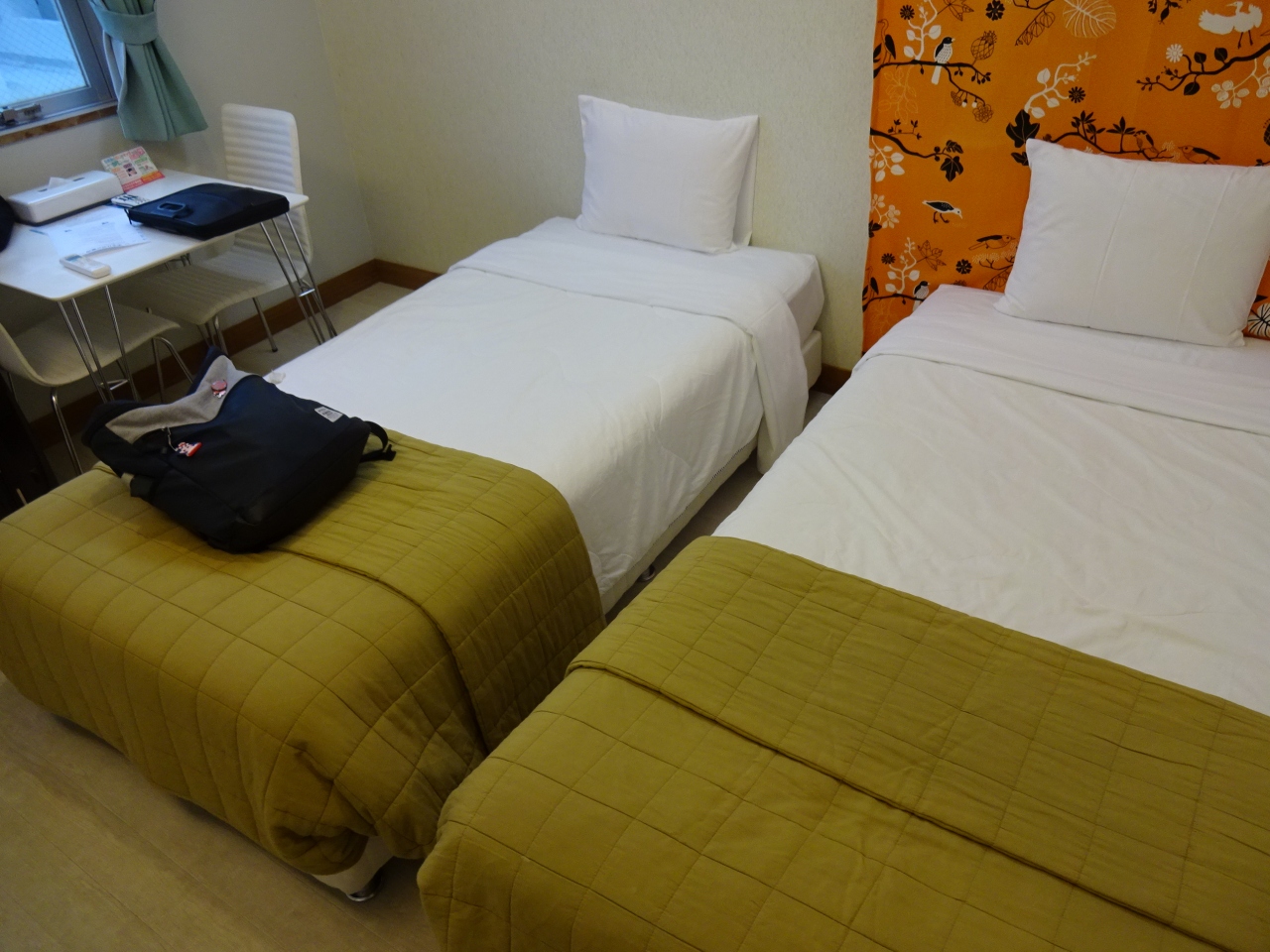 部屋はツインルームを利用。リーズナブルな価格でしたので、狭い部屋かなと思っていました。しかし、テーブルがあったり、スーツケースを広げられるスペースがあったりと思ったより広かったです。ユニットバスも客室についており、こちらも窮屈さは感じませんでした。