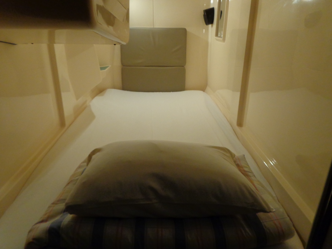 チェックインは午前中からできますが、キャビンの使用は17時からのようです。2階にあるロッカーに荷物を預けることができます。ただ、大きめのスーツケースは収納が難しいかと思います。