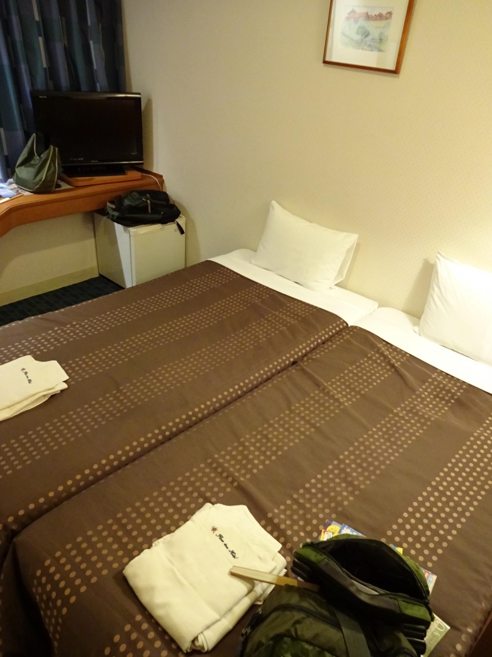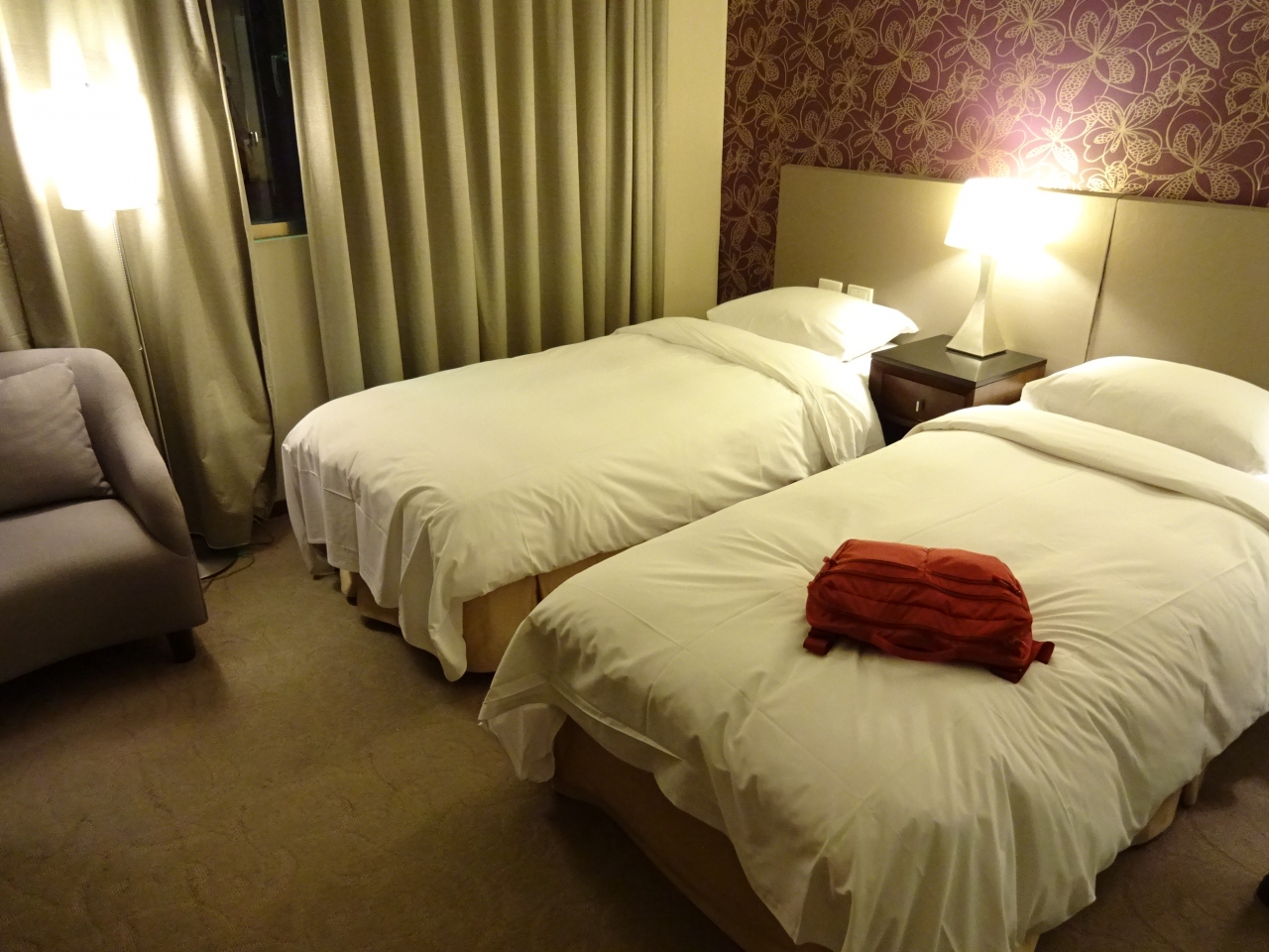 今回はツインルームを予約。部屋に入るとベッドが2つくっついており、パッと見ダブルルームのように見えました。また、シングルルームにもう一つベッドを持ってきたかのようにも見えました。そのため、部屋はかなり狭かったです。