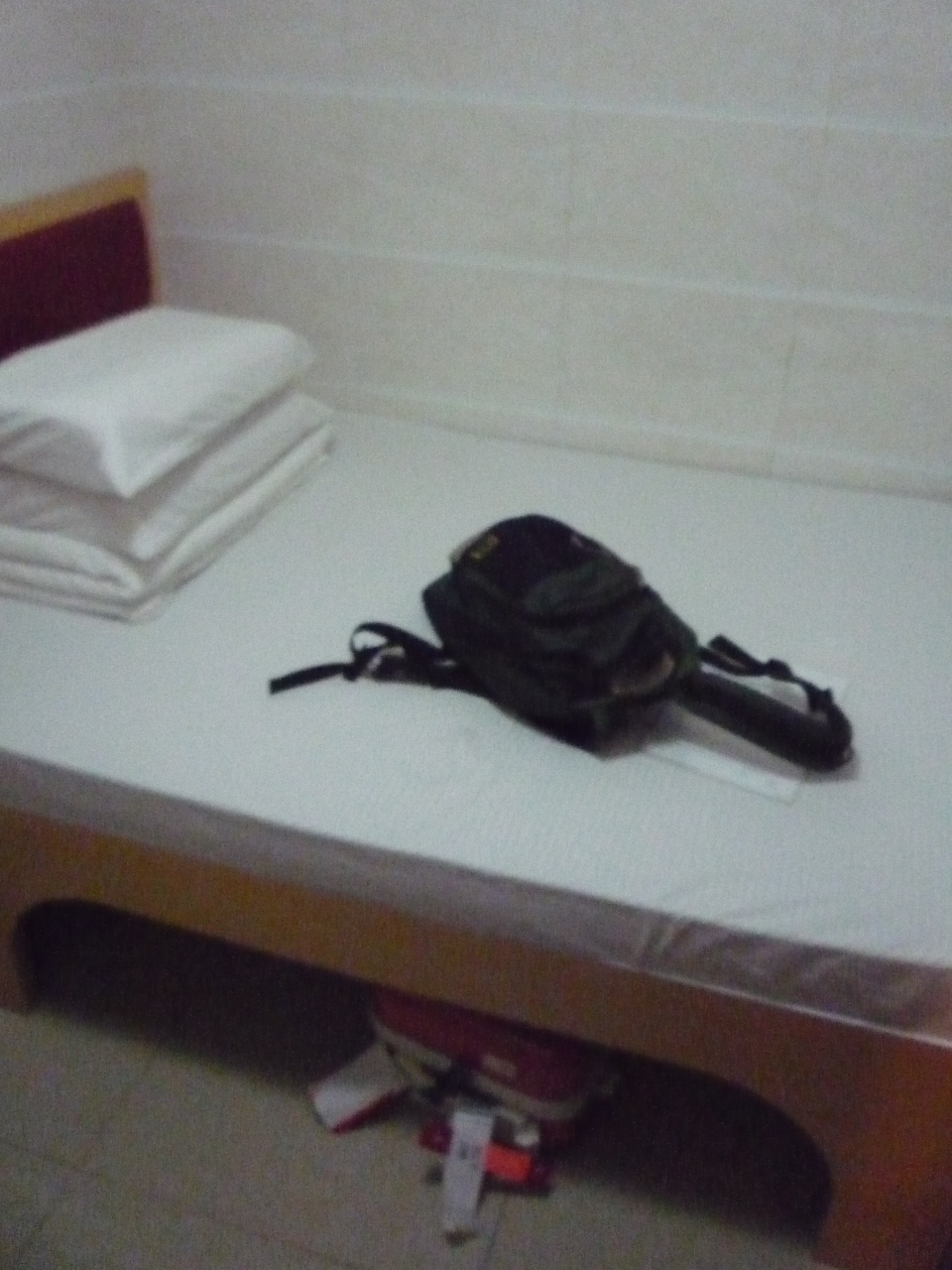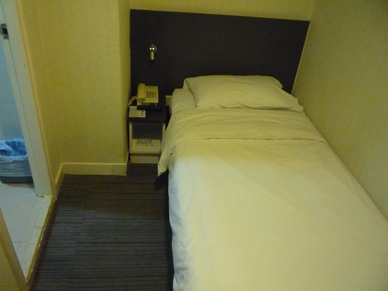 部屋は窓がなく、床にスーツケースを広げると足の踏み場がほとんどないくらいの広さです。大体3~4畳ほどしかありません。ただ、シャワー室とトイレが付いていて、ミネラルウォーターのサービスがあるのは、よかったです。