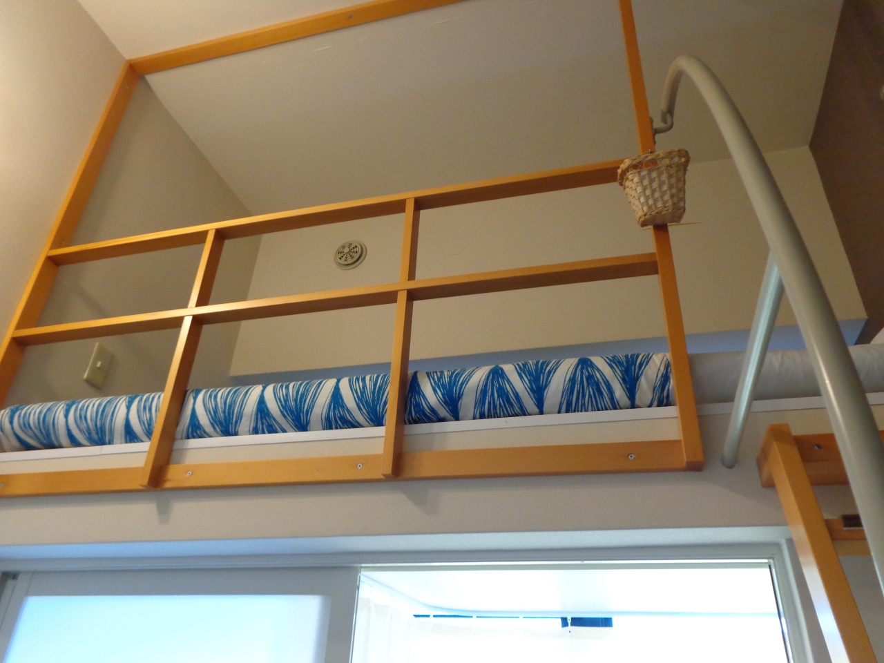 このホテル最大の特徴は、ロフトベッドかと思います。はしごでロフトへ上がって寝ますので、2段ベッドの上段で寝るイメージです。狭い客室でも空間を有効に活用しているなと思いました。
