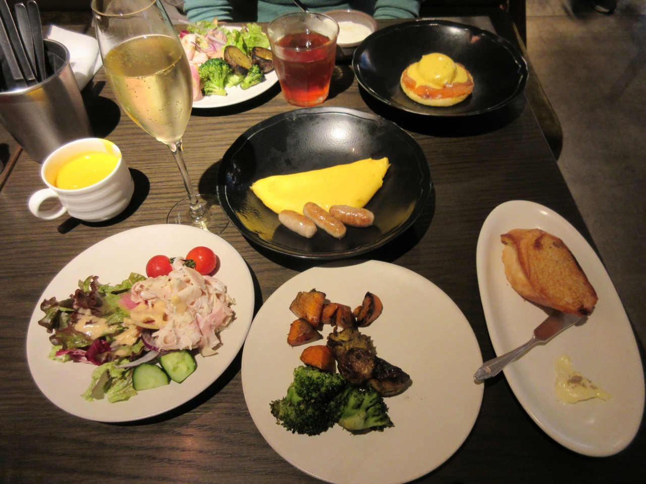 朝食は1階のレストランスペースで、メインを4品から1つ選び、ドリンクやサラダはセルフサービス方式でした。中でもびっくりしたのが、ドリンクのラインナップに「スパークリングワイン」がありました。サラダバーにあるサラダ類をアテに朝からスパークリングワインという贅沢な朝を楽しむこともできます。- 旅行時期
