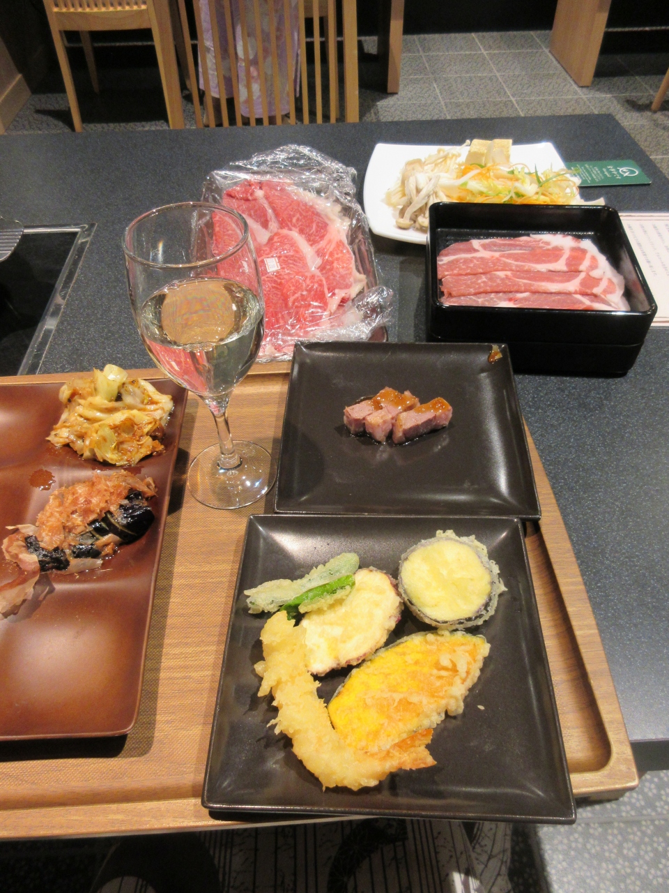 夕食はビュッフェスタイルで、しゃぶしゃぶでした。他にも揚げたての天ぷらや焼き立てのポークステーキもありました。