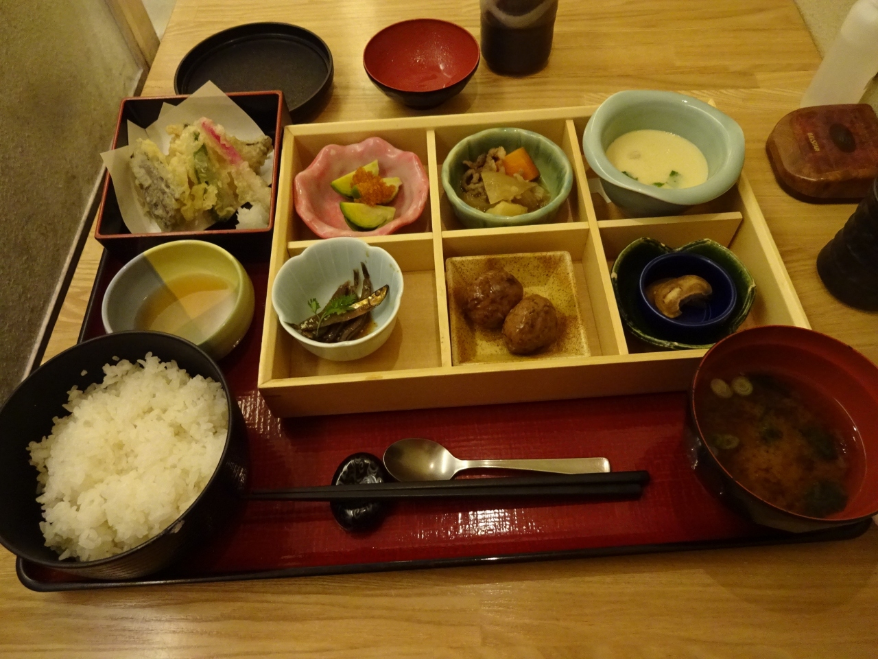 この時オーダーしたのは「おばんざい定食」。メインは3種類から1つ選び、副菜は10種類の中から4種類選ぶスタイルでした。私はメインは天ぷら、副菜は直感で4種類選びました。