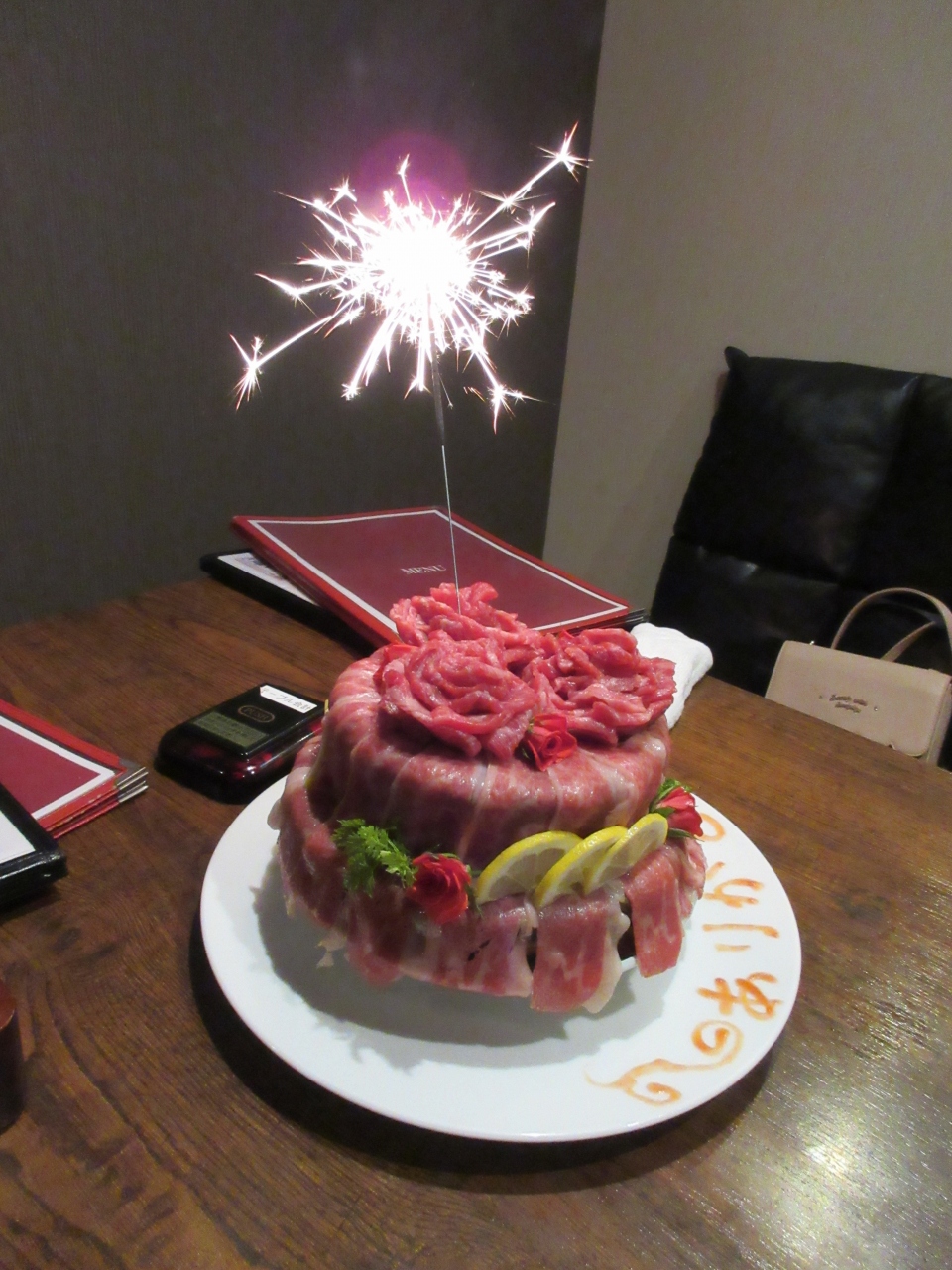 前菜に牛すじ煮込みとサラダが出て、馬刺し3種盛り、メインともいえる肉のケーキ、熊本名物の太平燕、馬肉のそぼろ丼、デザートと盛りだくさんでした。肉のケーキは、焼肉形式で食べ始め、固形燃料がなくなったら、焼き肉を続けるかしゃぶしゃぶにアレンジしてもらうことができます。しゃぶしゃぶにしてもらうと、肉のケーキを二度楽しむことができました。