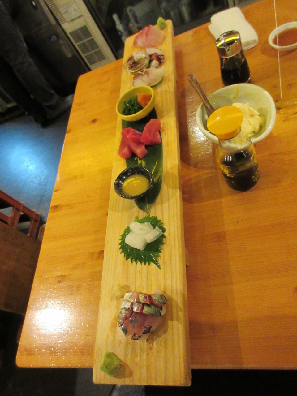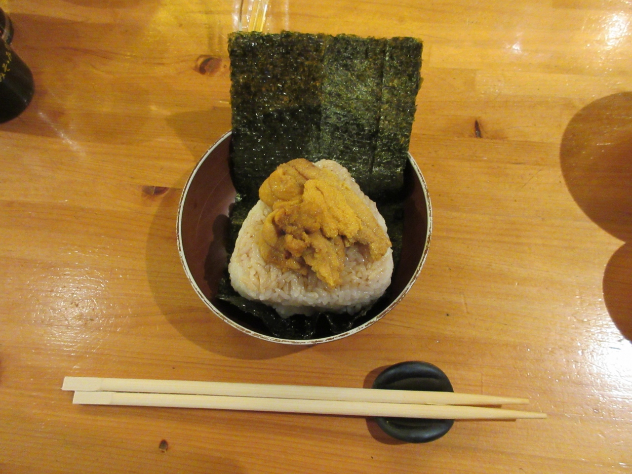 「水産」という名の付いた通り、海鮮系の居酒屋です。刺身盛り合わせを頼んだところ、長い板に乗った感じで出てきました。なかなかの迫力があり、ボリュームもありました。締めにウニおにぎりを頼んだところ、ソフトボールほどの大きさのおにぎりが出てきました。