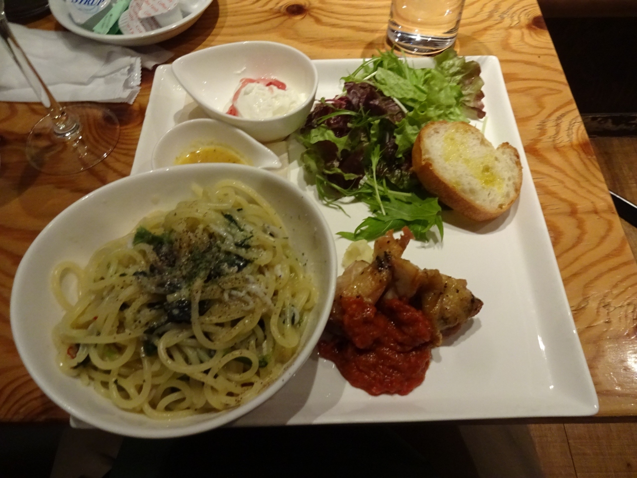 今回は、1000円のランチセット。3種類のパスタから1種類選び、前菜と肉料理、デザートがワンプレートで提供されます。パスタは、無料で大盛りにできます。また、コーヒーや紅茶も付いてきます。